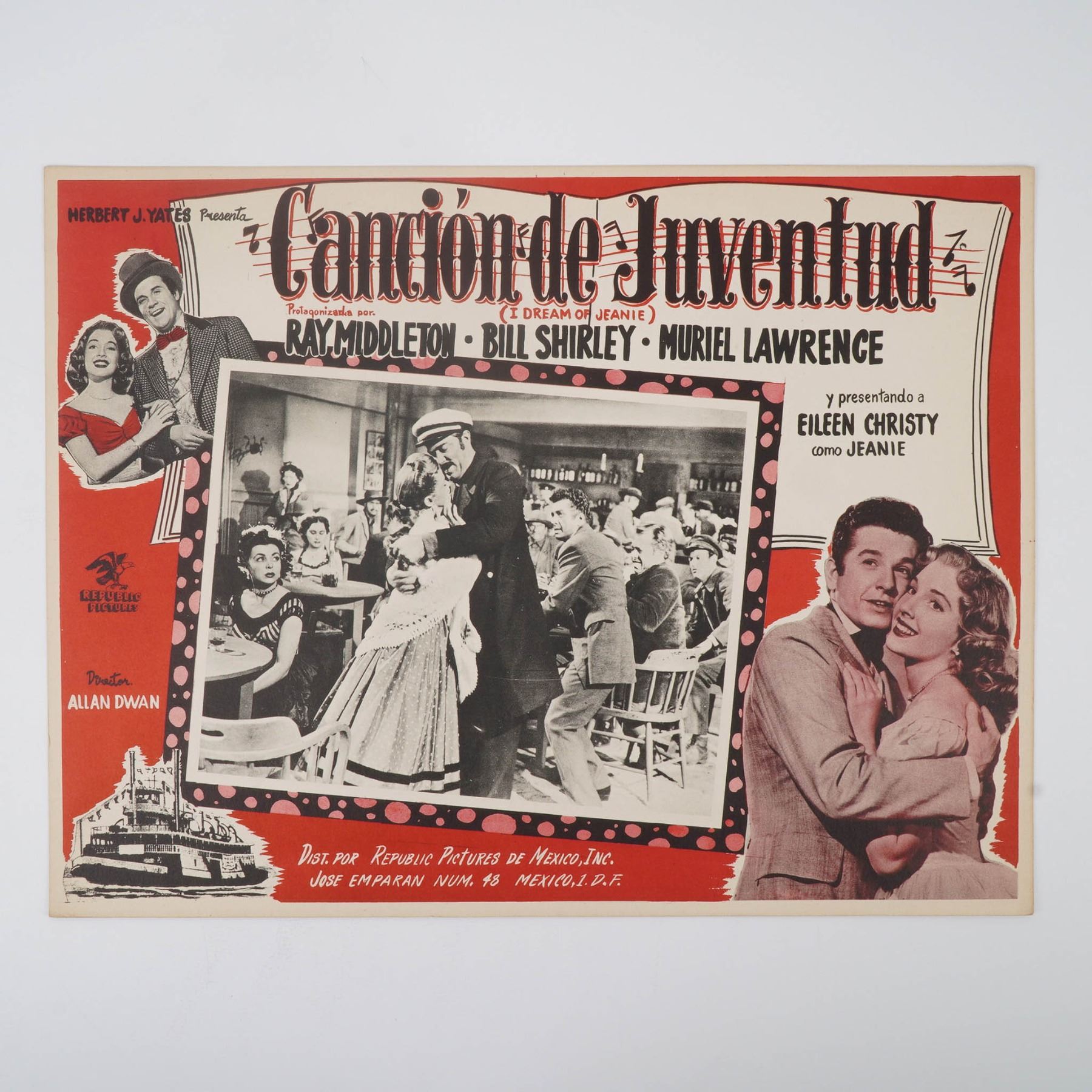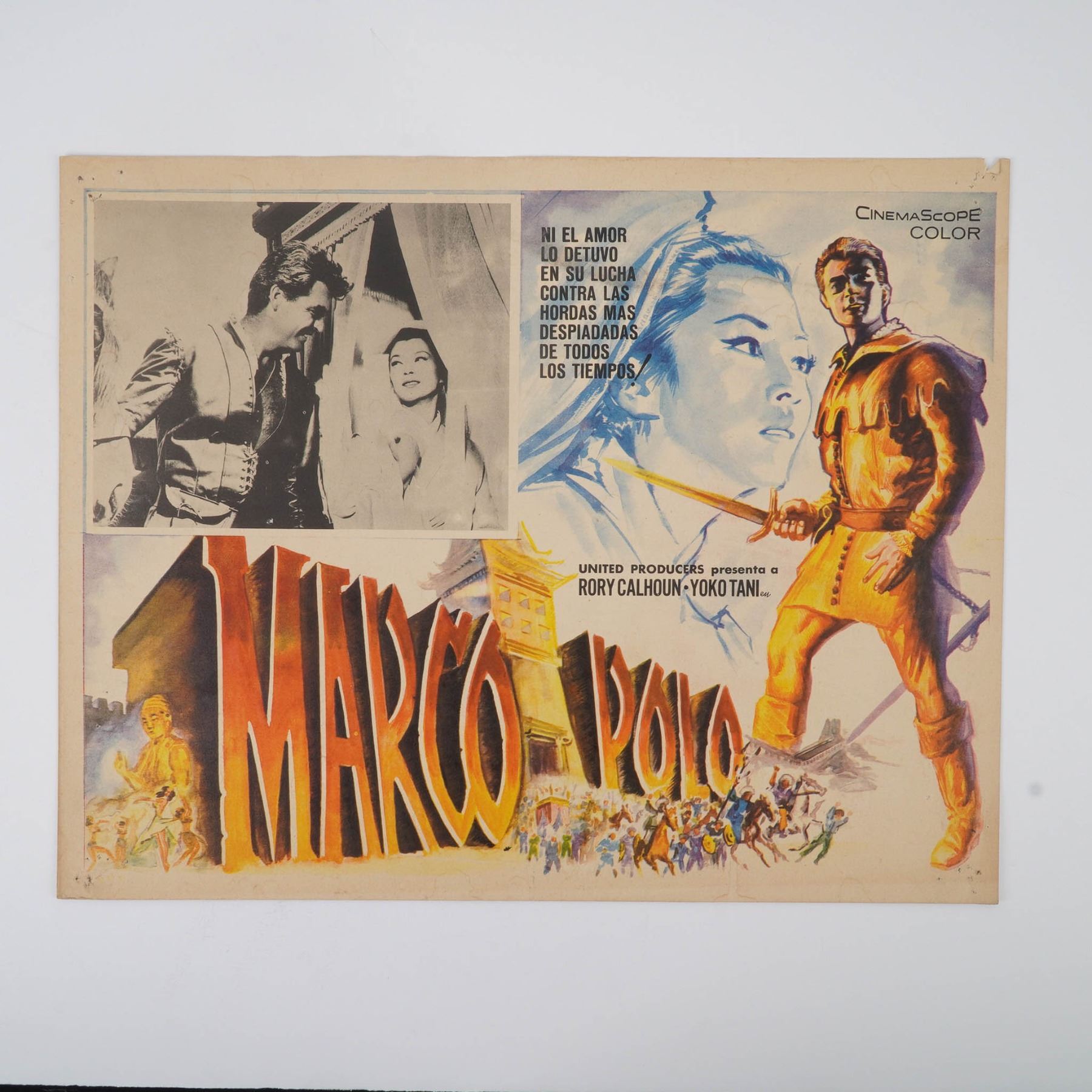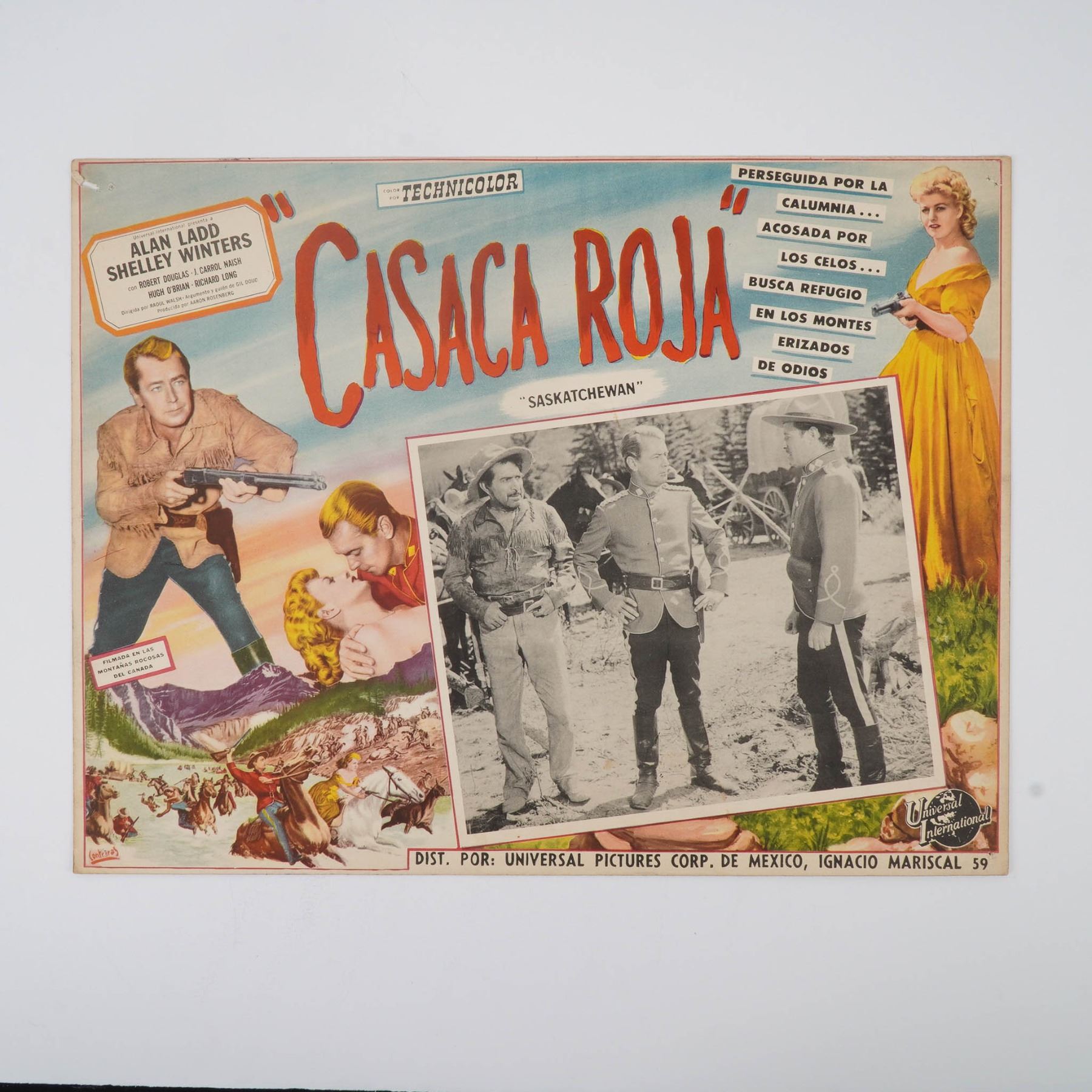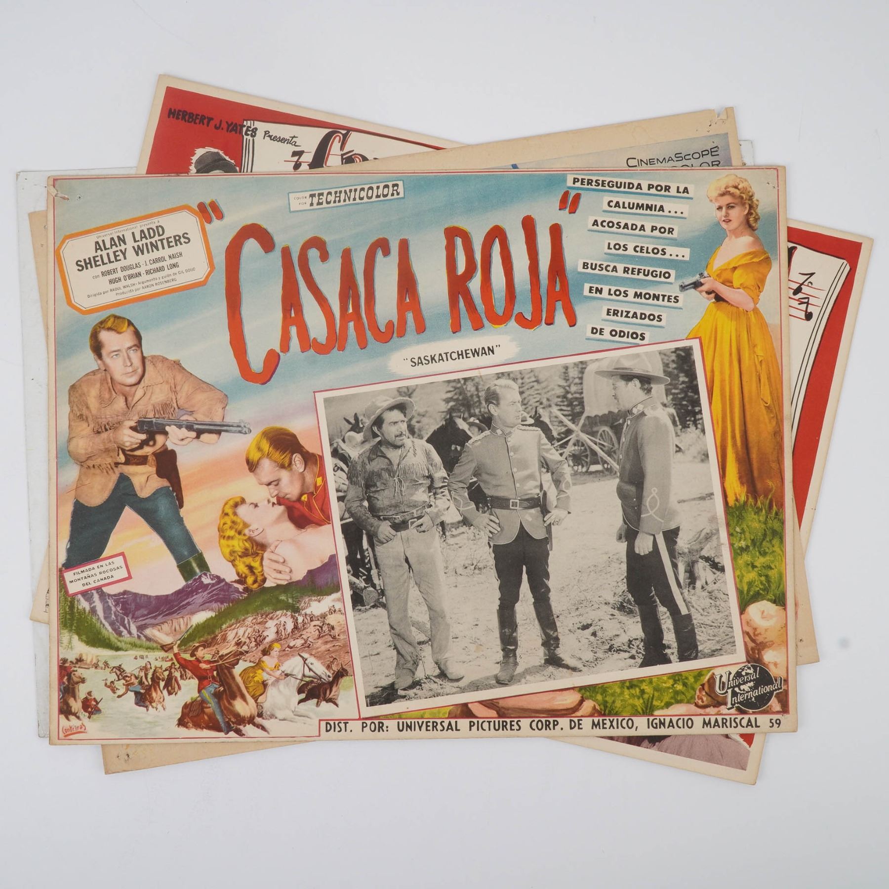 Collection of four vintage Mexican lobby cards featuring mid-20th century films: Chamango El Vengador starring George Ardisson, Cancion de Juventud (I Dream of Jeanie) with Ray Middleton and Eileen Christy, Marco Polo with Rory Calhoun and Yoko Tani, and Casaca Roja (Saskatchewan) starring Alan Ladd and Shelley Winters. Each card presents vibrant illustrations and production stills typical of classic Mexican film promotion, printed in Mexico and distributed by various studios including Universal and Republic Pictures. Each measures approximately 12.5"H x 16.5"L.