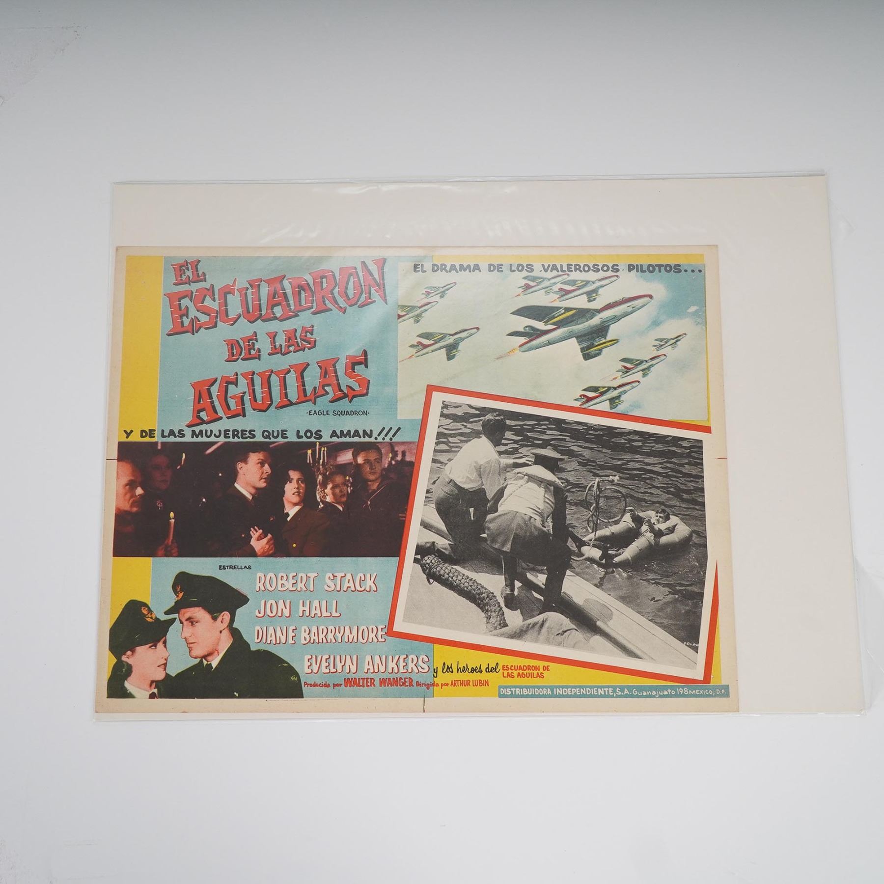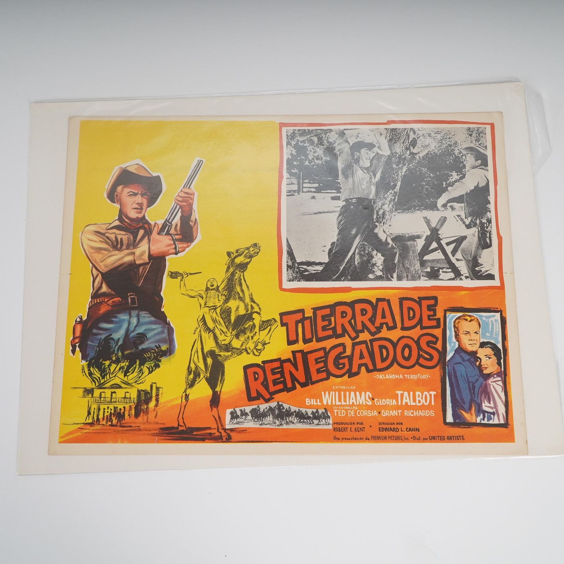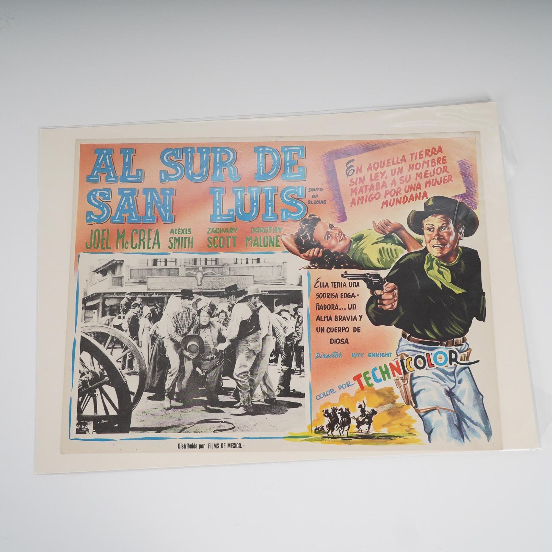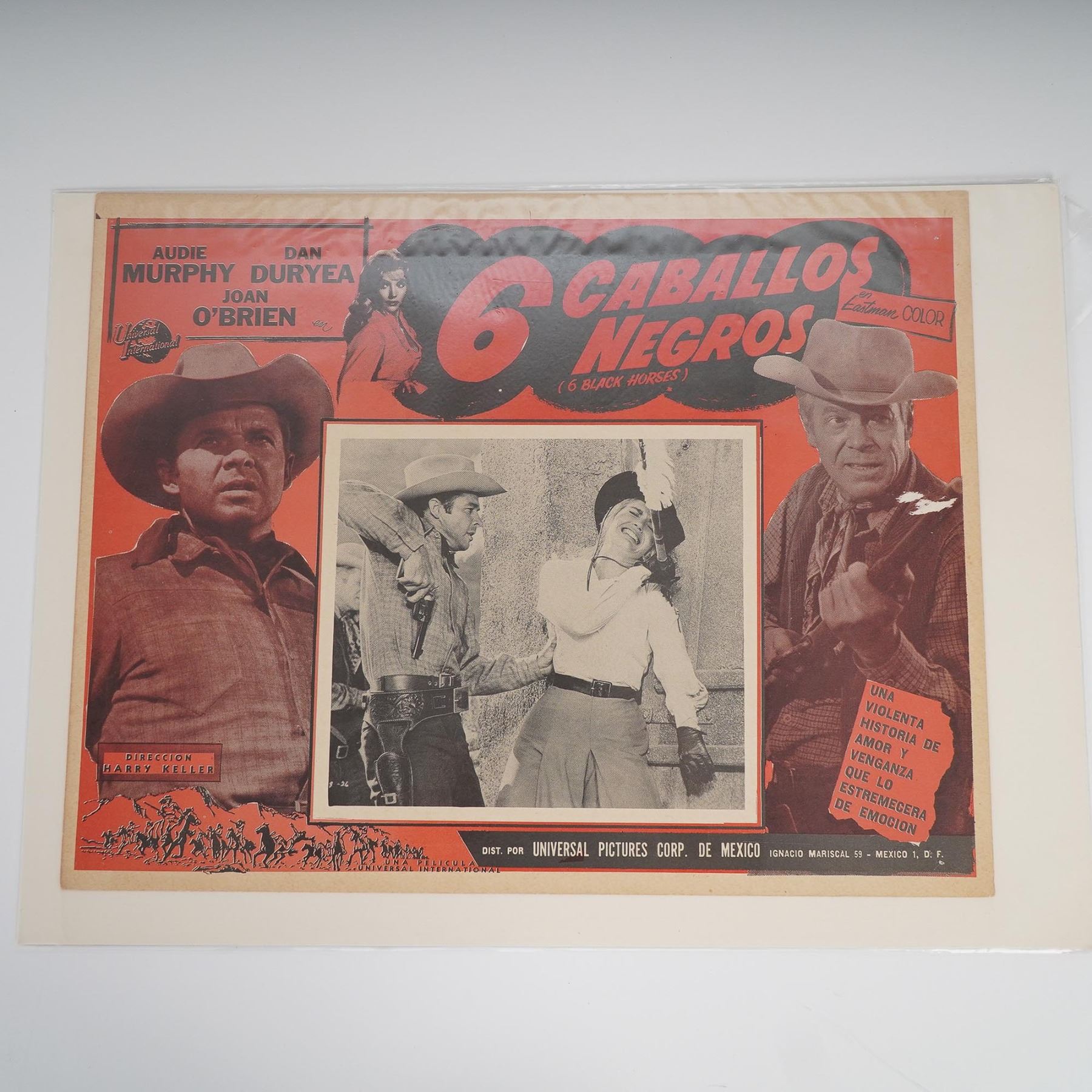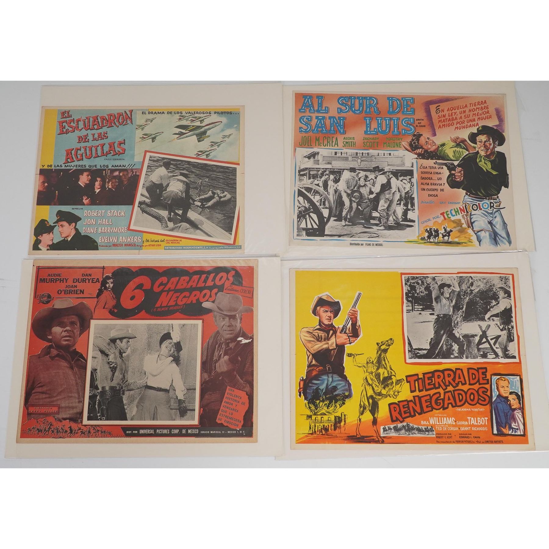 A group of four original Spanish-language lobby cards promoting mid-century American films. This set includes: El Escuadron de las Aguilas (Eagle Squadron) starring Robert Stack, Jon Hall, and Diane Barrymore. A WWII-themed drama featuring patriotic imagery and romantic subplots; Al Sur de San Luis (South of St. Louis) starring Joel McCrea and Alexis Smith. A Technicolor Western filled with action and betrayal; 6 Caballos Negros (6 Black Horses) starring Audie Murphy, Dan Duryea, and Joan O'Brien. A suspenseful revenge Western directed by Harry Keller; Tierra de Renegados (Oklahoma Territory) starring Bill Williams and Gloria Talbot. A dramatic frontier tale of lawlessness and redemption. Each vibrant card features bold graphics and composite images in vivid mid-century colors with inset black-and-white production stills. Printed in Mexico for Spanish-speaking markets.
