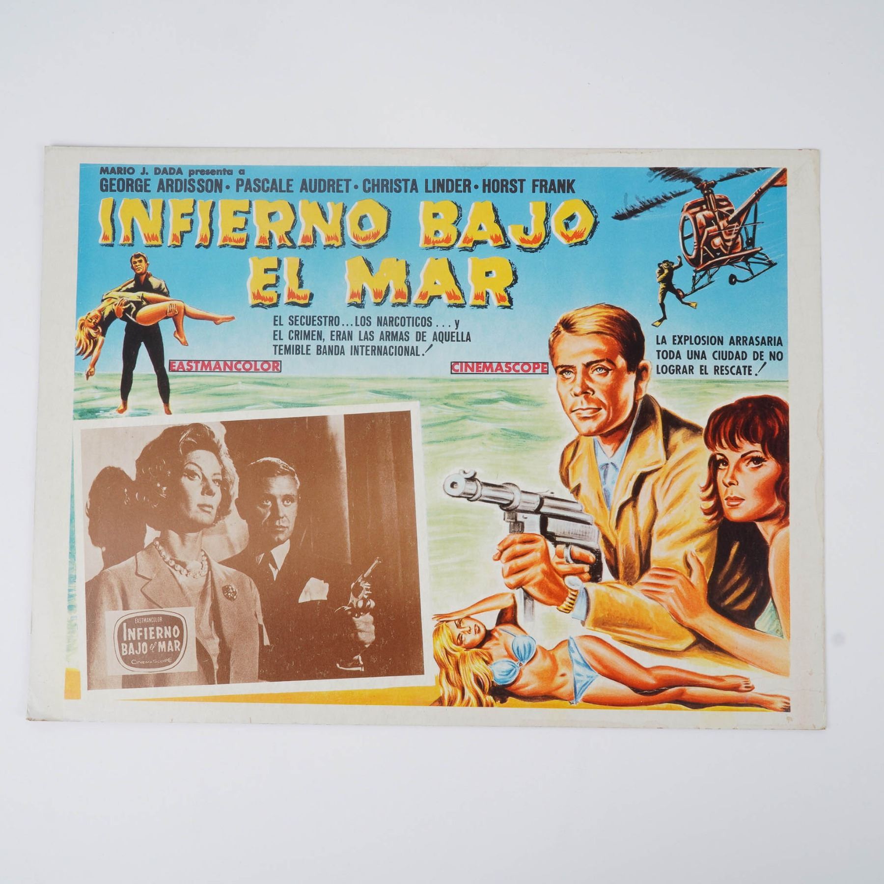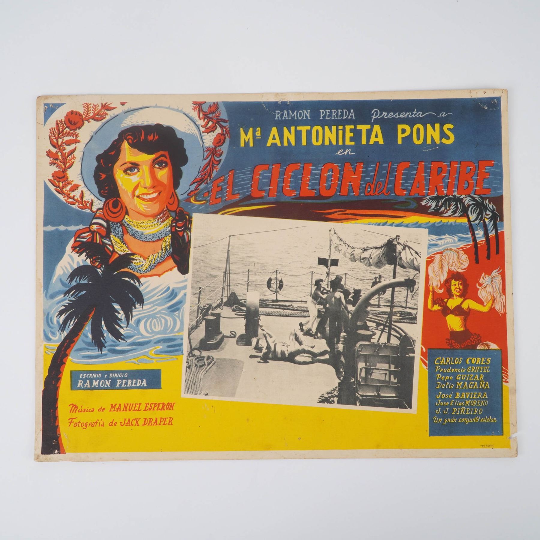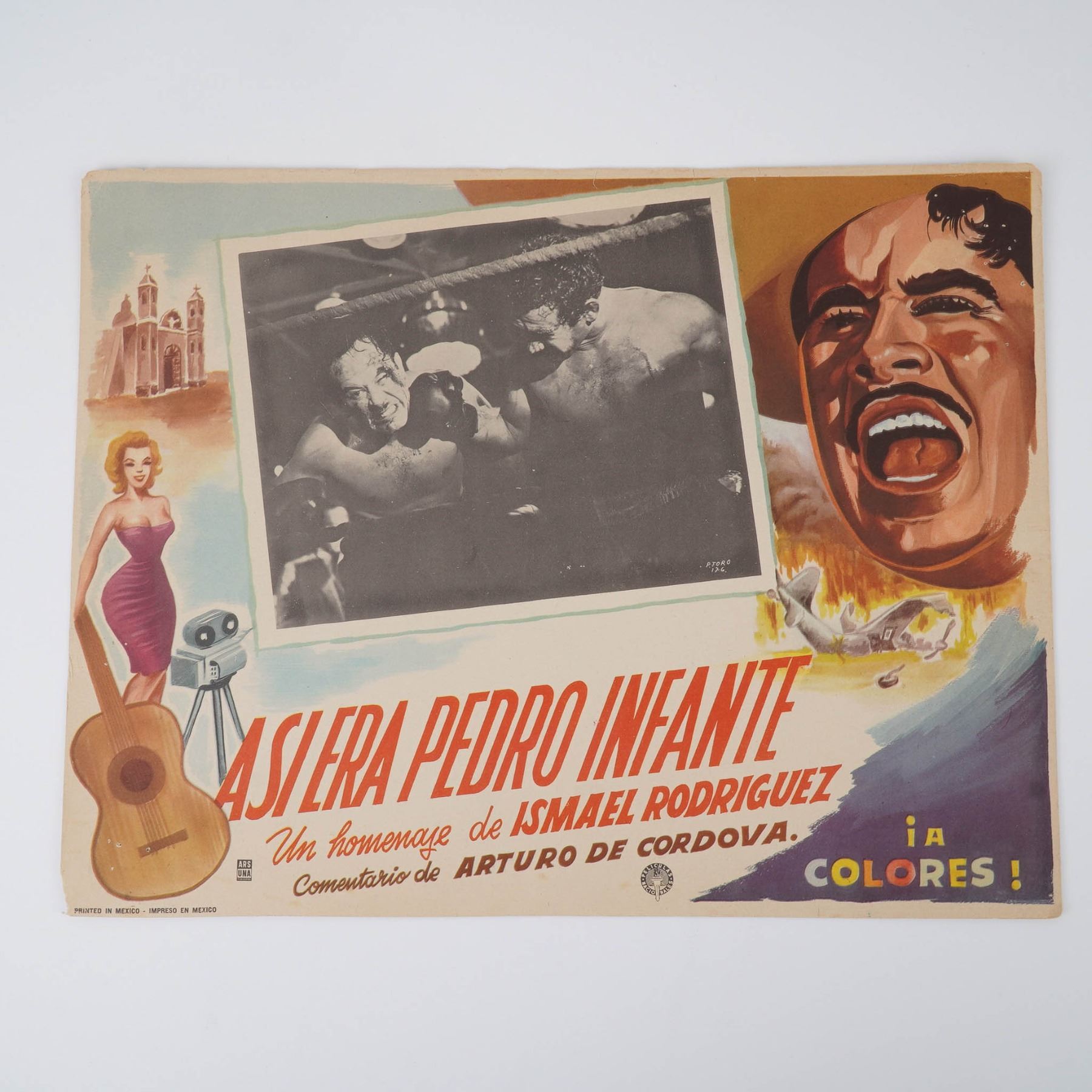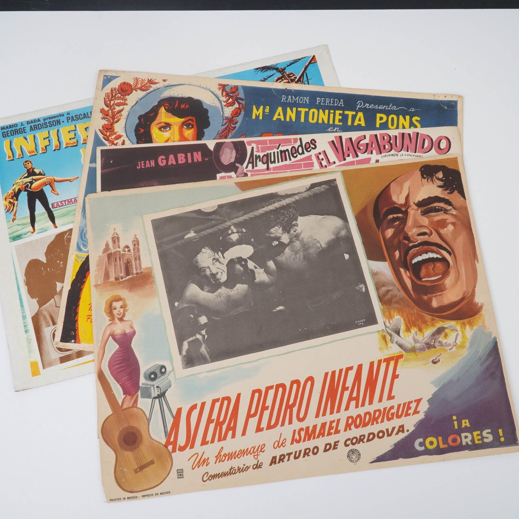 A group of four vibrant mid-century Mexican film lobby cards, each showcasing colorful graphics and dramatic scenes from iconic cinema. Included in the lot are: Asi era Pedro Infante, a tribute film honoring the legendary actor and singer; El Ciclon del Caribe, starring Antonieta Pons; Arquimedes el Vagabundo, featuring French actor Jean Gabin; and Infierno Bajo el Mar, a crime thriller with George Ardisson and Christa Linder. These original lobby cards, printed in Mexico, reflect the bold visual storytelling and popular stars of the golden age of Mexican and international cinema.