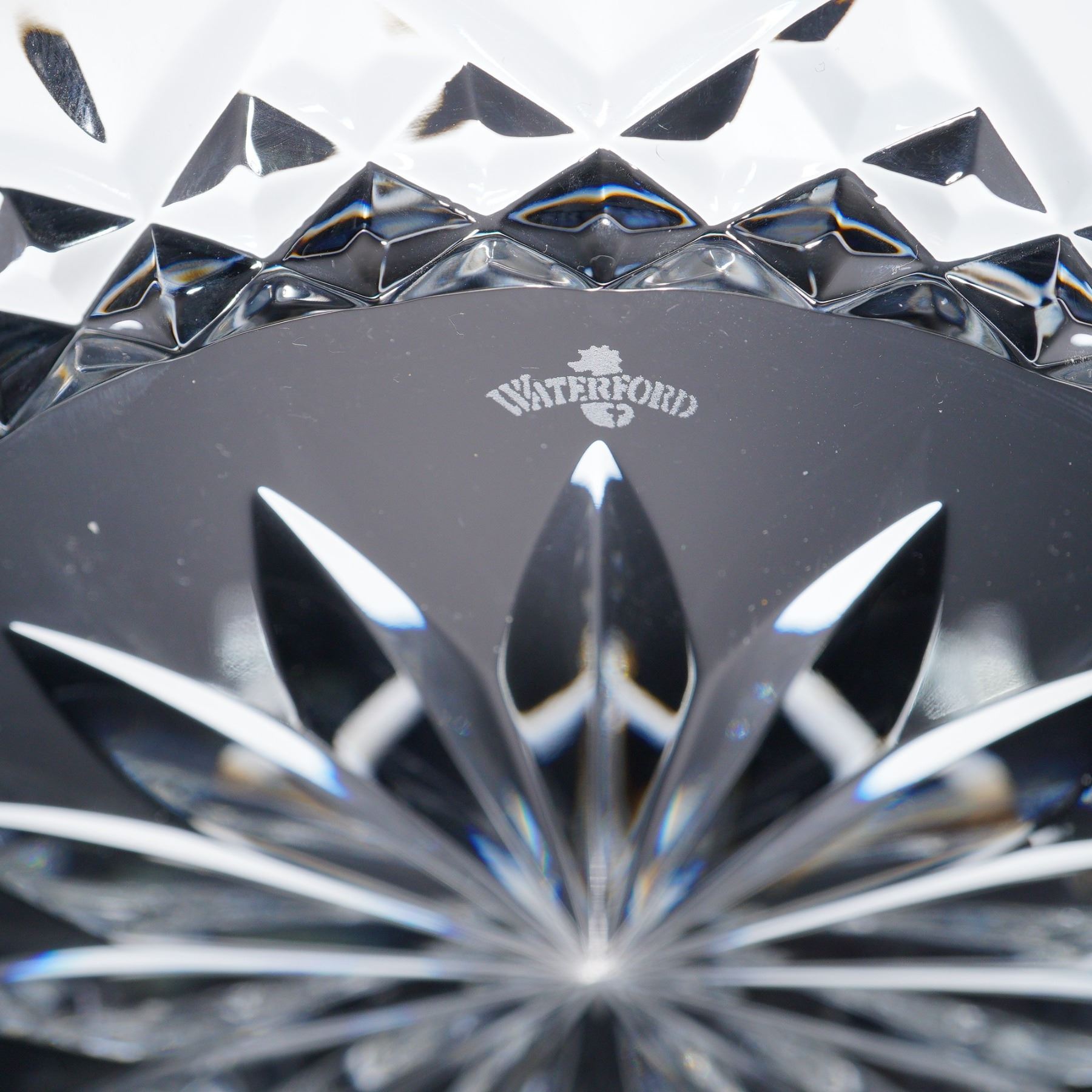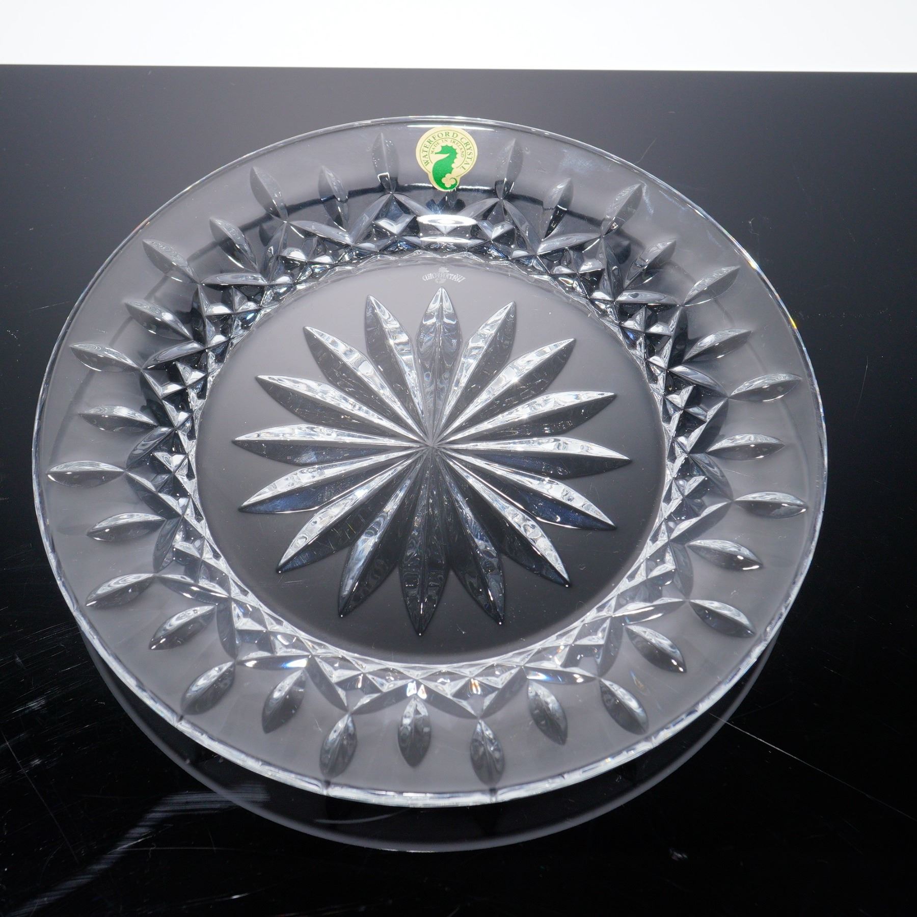 Set of four Waterford crystal salad plates in the classic Lismore pattern, showcasing the timeless combination of radiant starburst centers and elegant diamond and wedge cuts. Each plate features the Waterford acid-etched hallmark and retains the original green and gold foil sticker. Includes two original Waterford boxes, each containing a matched pair. A beautiful set ideal for fine dining or formal display.