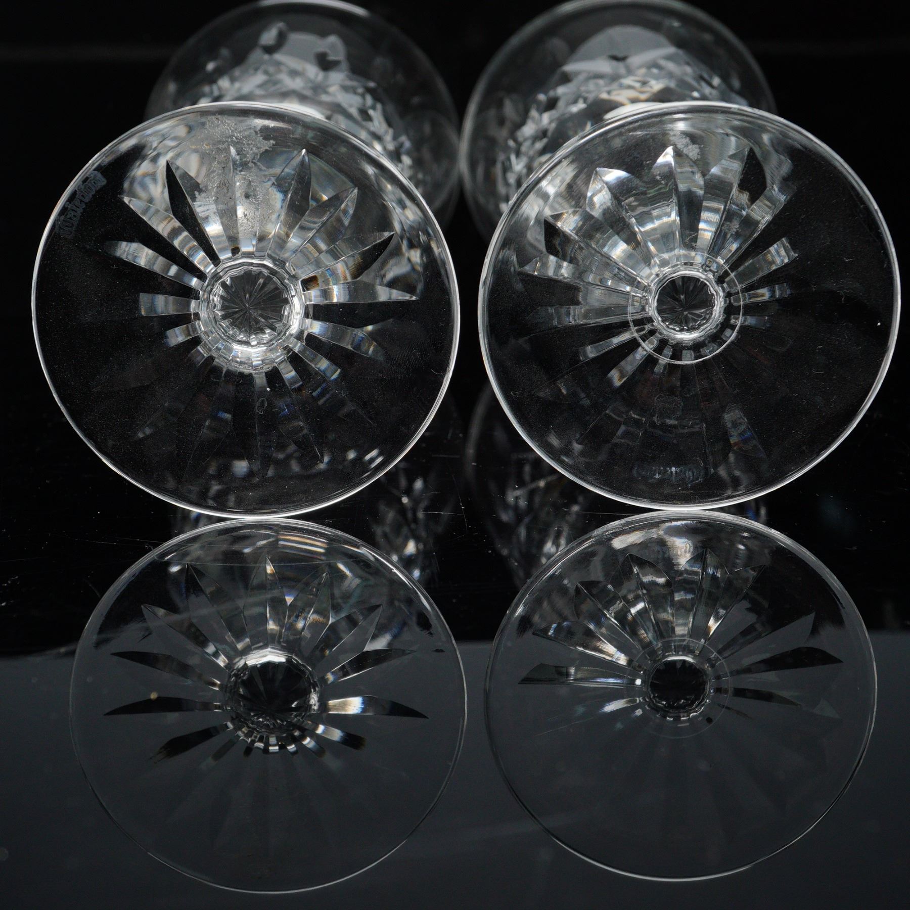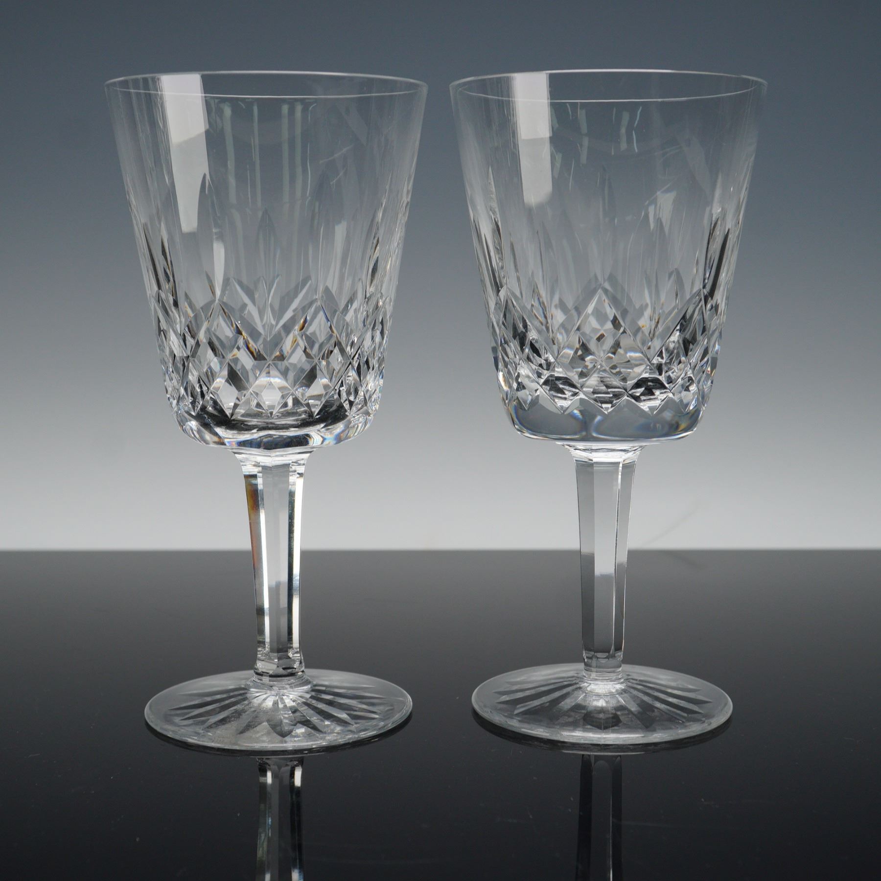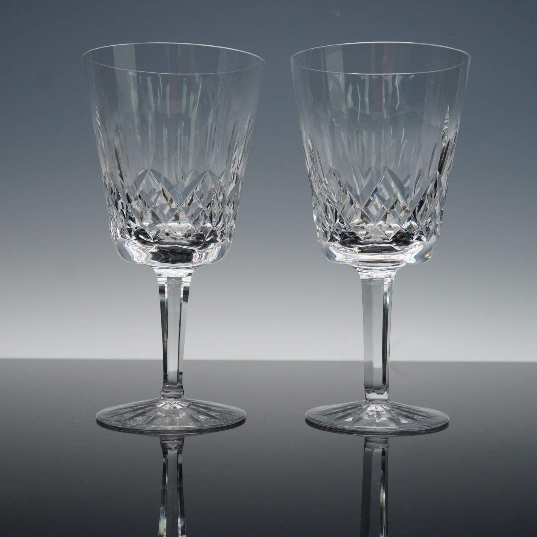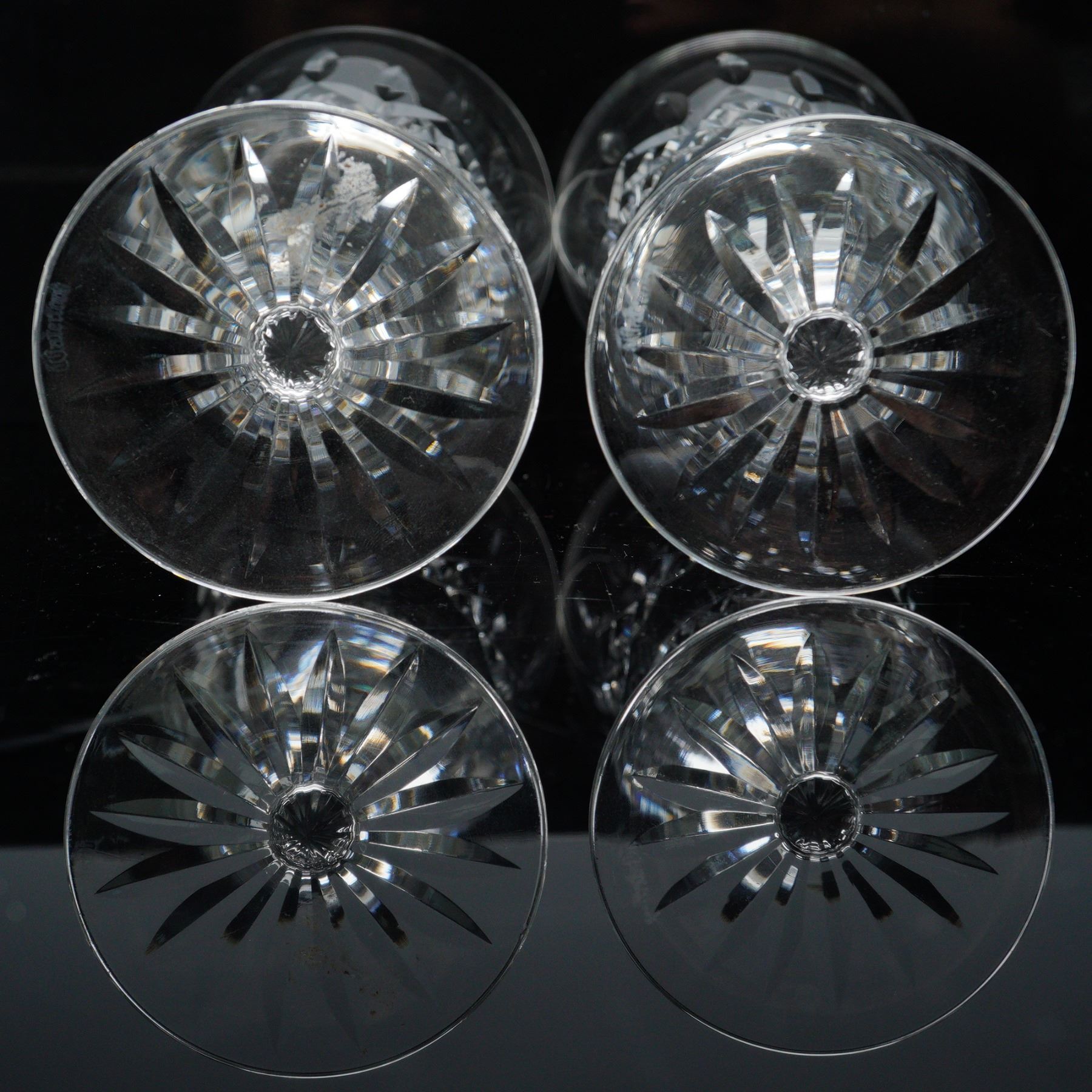 Set of four Waterford crystal water goblets in the iconic Lismore pattern, showcasing brilliant clarity and a distinctive cut diamond and wedge motif that has become one of the most recognizable designs in fine crystal. Each goblet is crafted with a faceted stem that adds both elegance and balance, making them ideal for formal dining or display. The bases are acid-etched with the Waterford backstamp, ensuring authenticity and heritage. This timeless design has remained a favorite among collectors and those who appreciate fine craftsmanship in tableware.