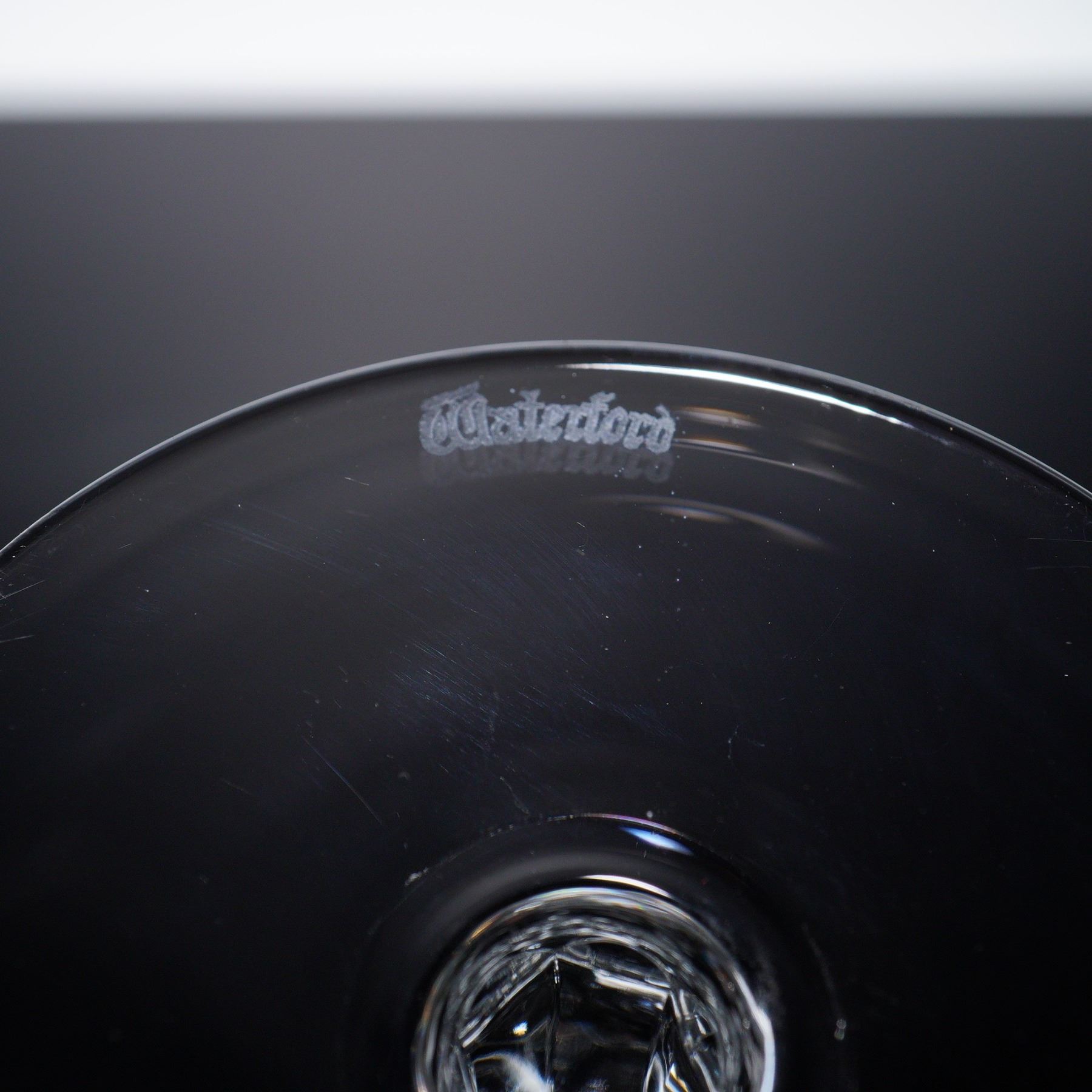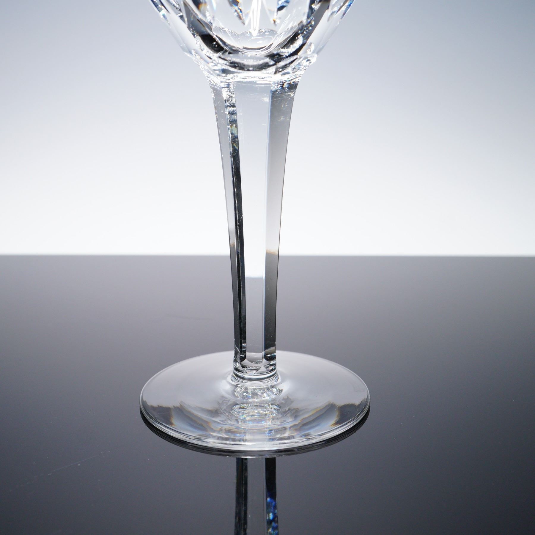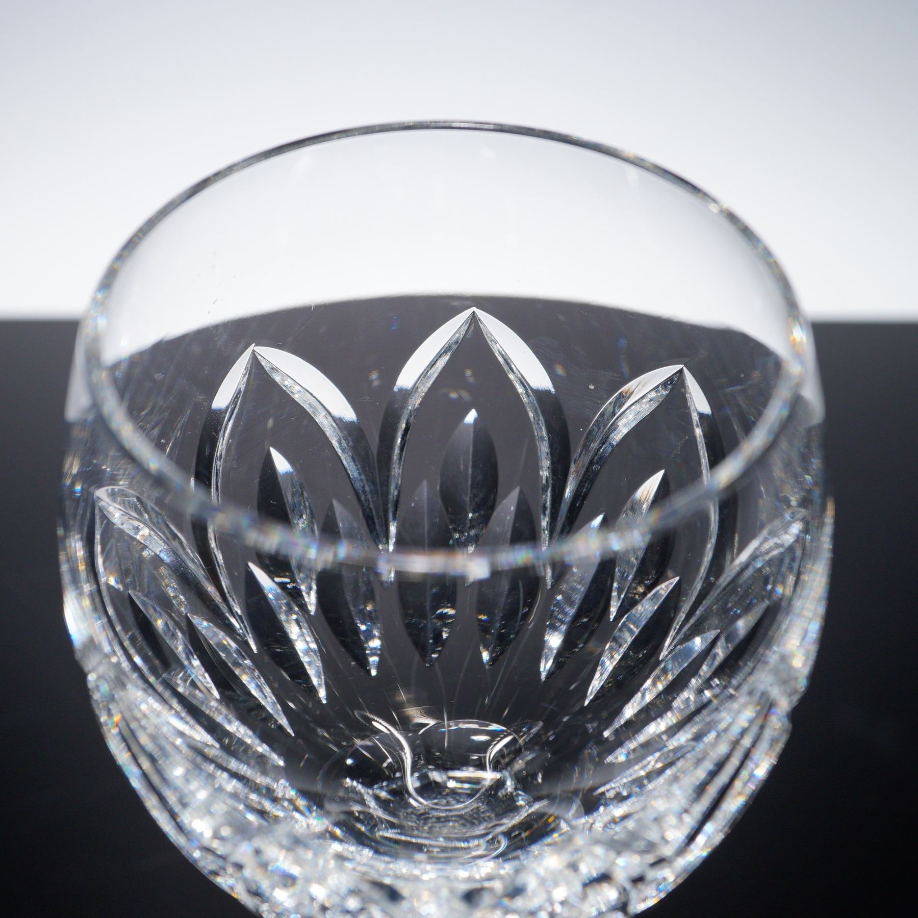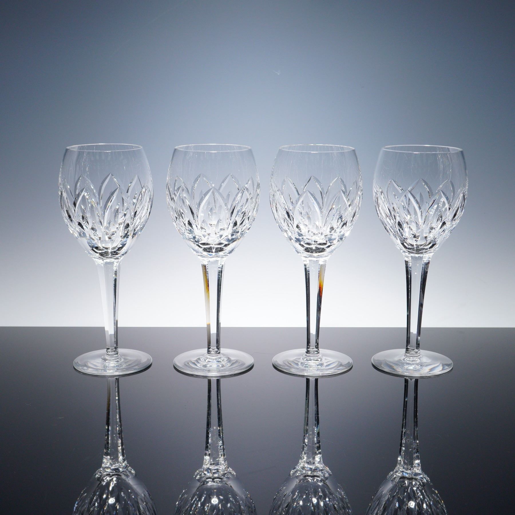 Set of four Waterford crystal wine goblets in the Ballylee pattern, featuring full round bowls with deep vertical leaf-and-fan cuts. The design offers striking brilliance and clarity, and each goblet is acid-etched with the Waterford mark on the foot. Measures 8"H.