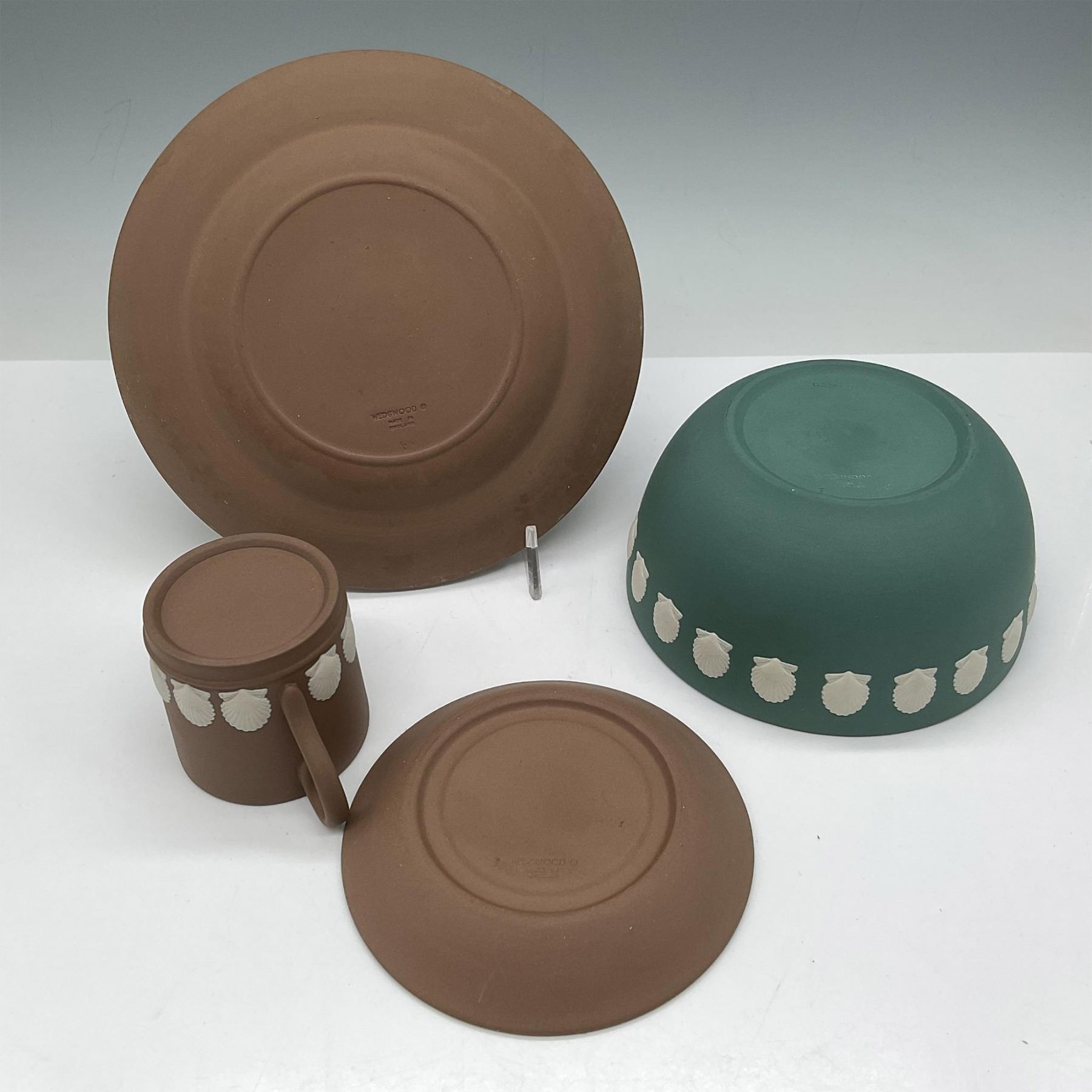 Seashell pattern is designed on rim of the dishes and cup. Lot includes spruce green bowl (2.5"H x 5" dia.); brown dessert plate (6.5" dia.); and demitasse cup and saucer. Wedgwood impressed mark. Largest piece 0.75"H x 6.5" dia.