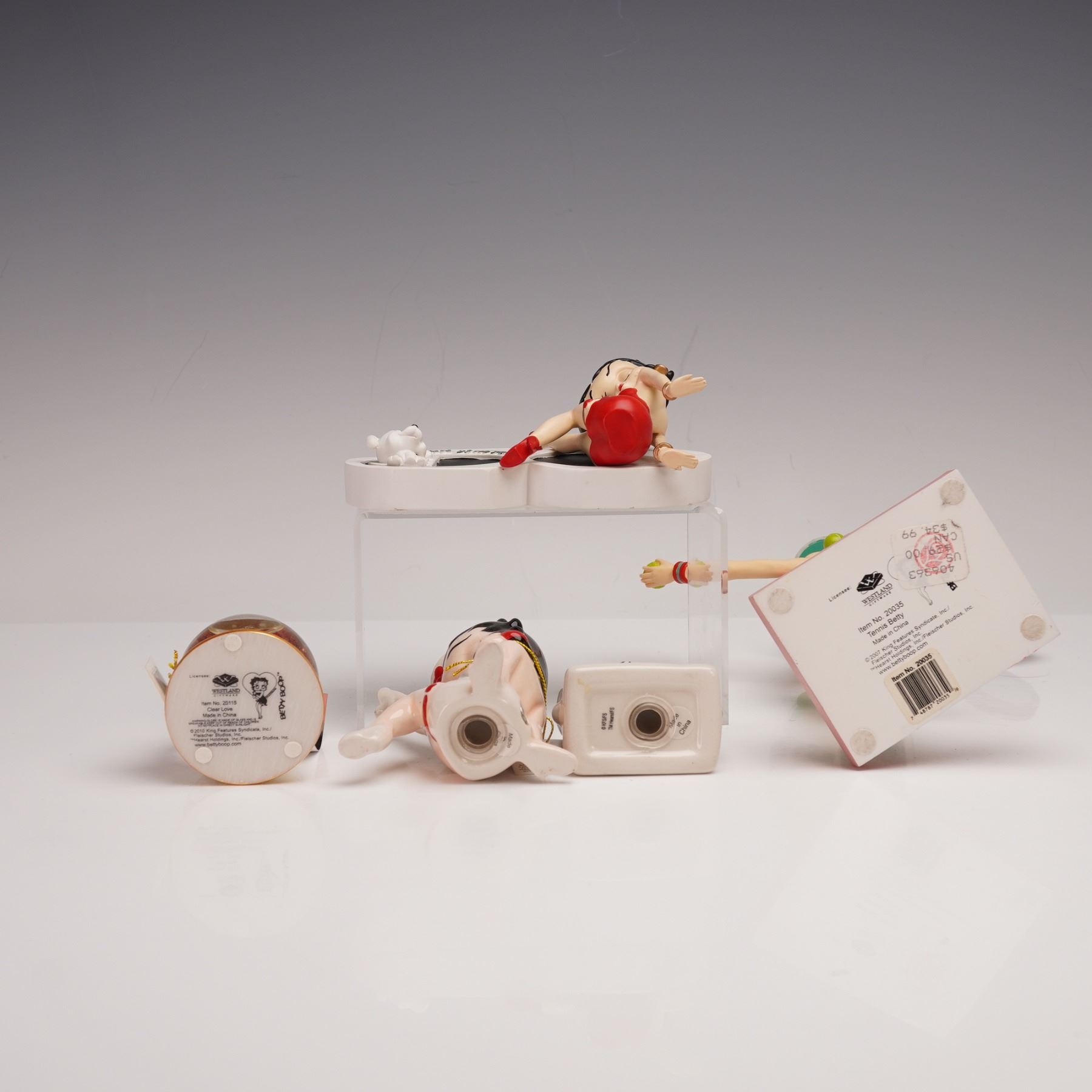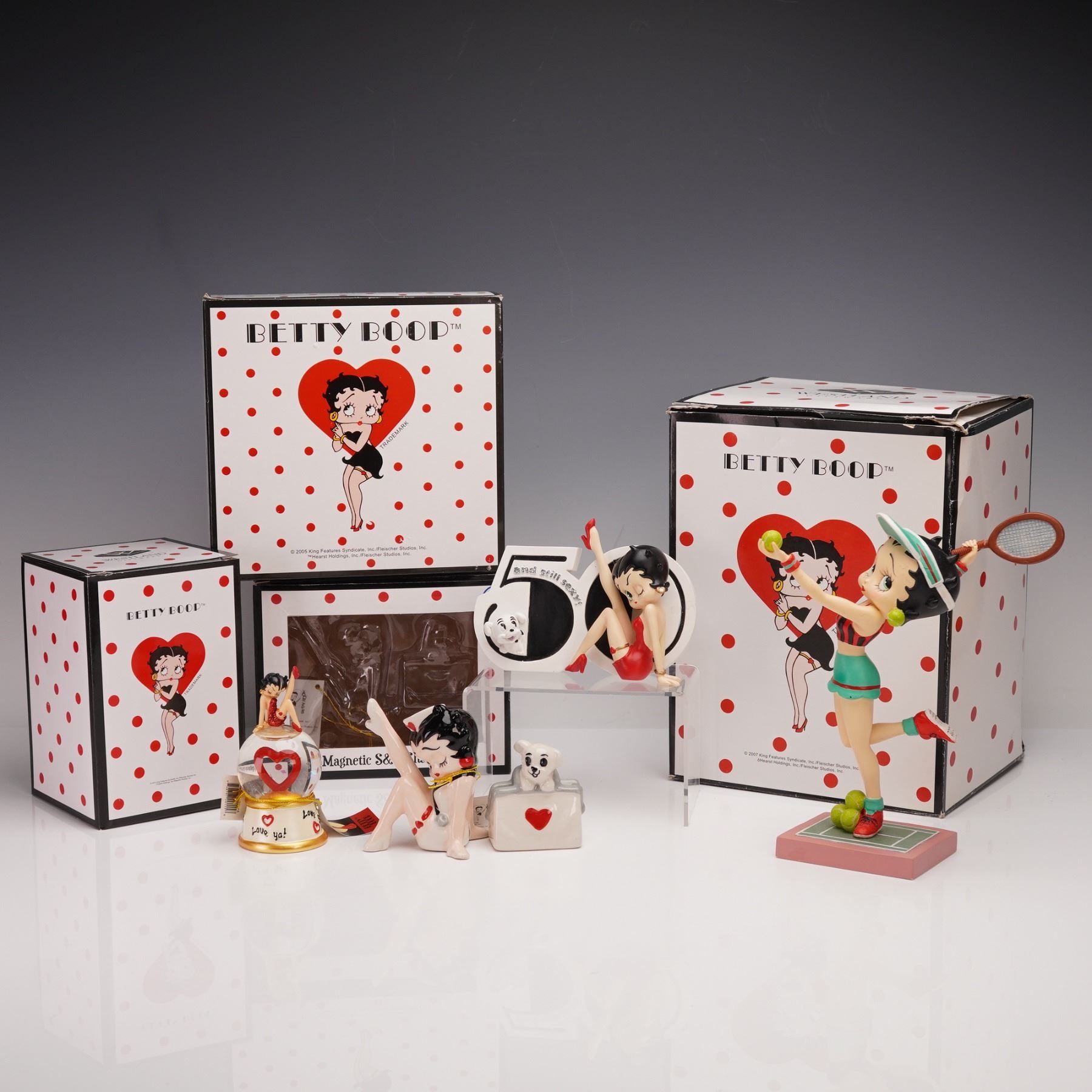 Featuring charming ceramic and resin figures depicting the beloved cartoon icon in playful and classic poses. The set includes "Sexy at 50" (No. 6775), showing Betty Boop in a red dress beside a bold "50" motif, celebrating her timeless allure; "Clear Love" (No. 20115), a water globe-style figure with Betty sitting atop a base decorated with a large red heart and gold trim that reads "I love ya!"; "Nurse Betty & Pudgy Magnetic Salt & Pepper Shakers" (No. 24050), featuring Betty Boop in a nurse outfit accompanied by her faithful dog Pudgy in coordinating shaker form; and "Tennis Betty" (No. 20035), showcasing Betty in sporty attire mid-swing with a tennis racket and balls at her feet. Each figure bears Westland Giftware marks and copyright symbols on the underside, along with officially licensed Betty Boop branding. This lot has its original boxes.