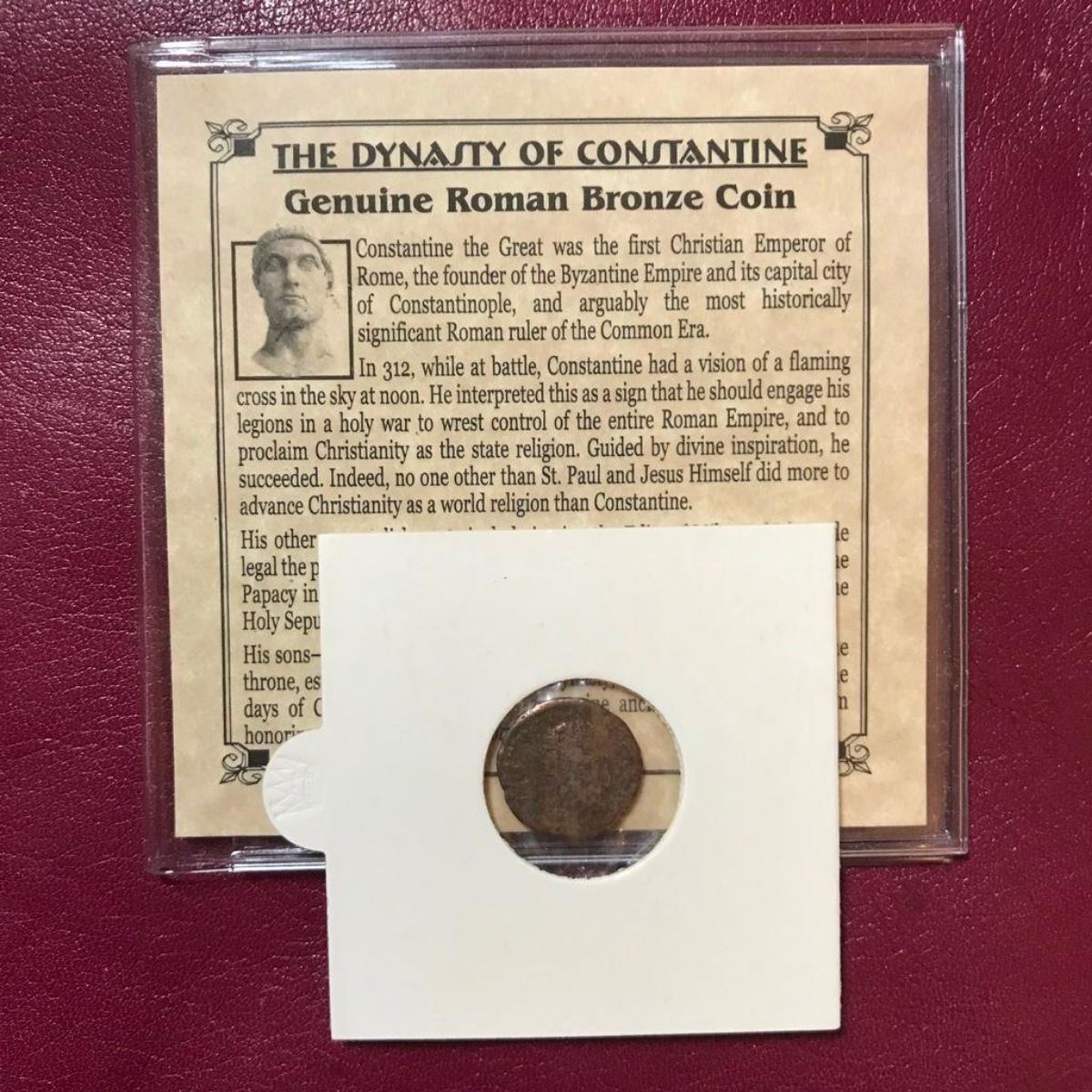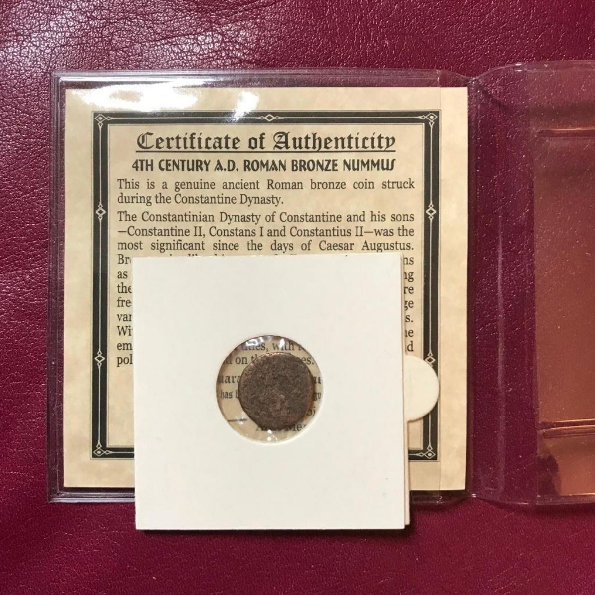 4th Century A.D. Roman bronze nummus, coin of Constantine The great. With protective sleeve, information about the coin & certificate of authenticity. 15mm coin.Â