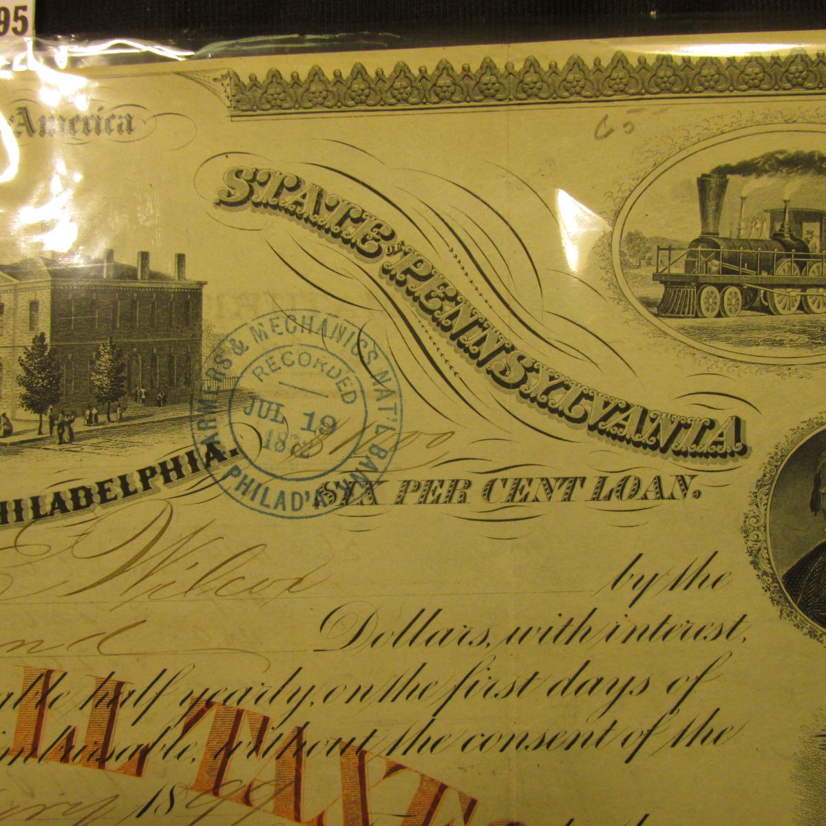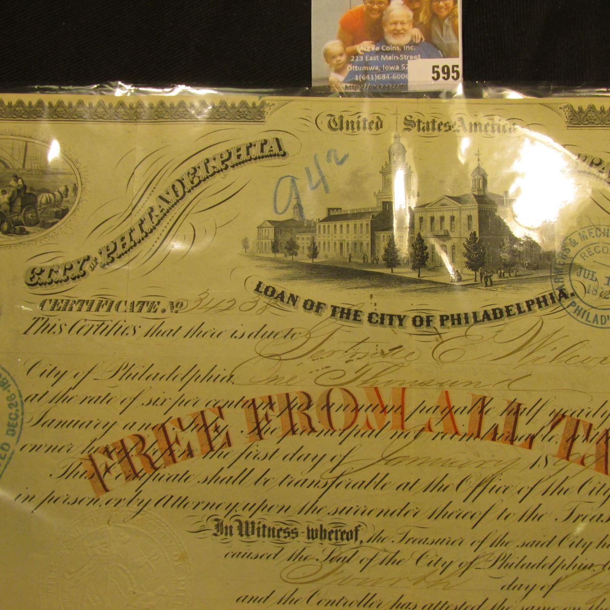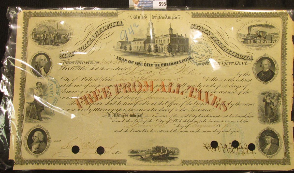 4th Day of August, 1870 "United States of America City of Philadelphia State of Pennsylvania Certificate No. 342238 Loan of the City of Philadelphia. Six Per Cent Loan." Over-printed in red "Free From All Taxes" various vignettes scattered across the note including George Washington, Benjamin Franklin, City Building, Locomotive, and etc., hole cancelled and stamped recorded Jul. 19, 1872 "Farmers & Mechanics Nat'l Bank".