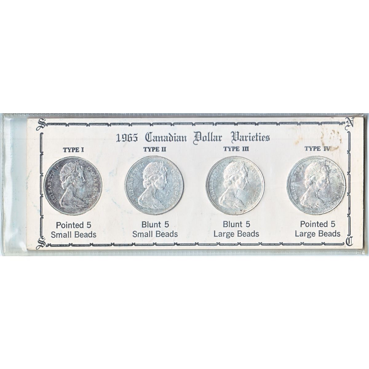 4x 1965 Canadian Silver Dollar Varieties in cardboard display holder. Buyers Premium will be added on all items as per our terms of sale. We accept Paypal, Credit Card, E-Transfer Payments, Cheque or Money Orders (there is an additional 3% fee for using Paypal or Credit Card). All invoices will be emailed immediately following the auction, please contact us if you would like to pay by credit card or receive a new revised lower total for mailing in payment or sending an e-transfer (3% discount). All Items Are Sold "AS IS", no returns