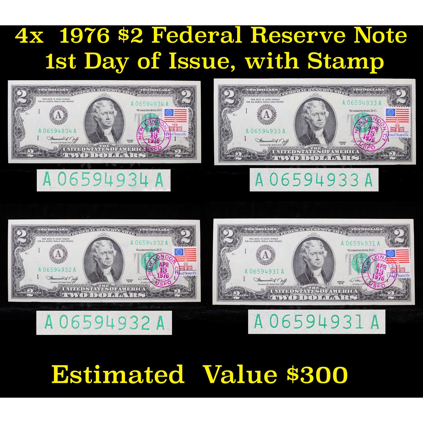 4x 1976 $2 Federal Reserve Note 1st Day of Issue, with Stamp Grades Gem CU