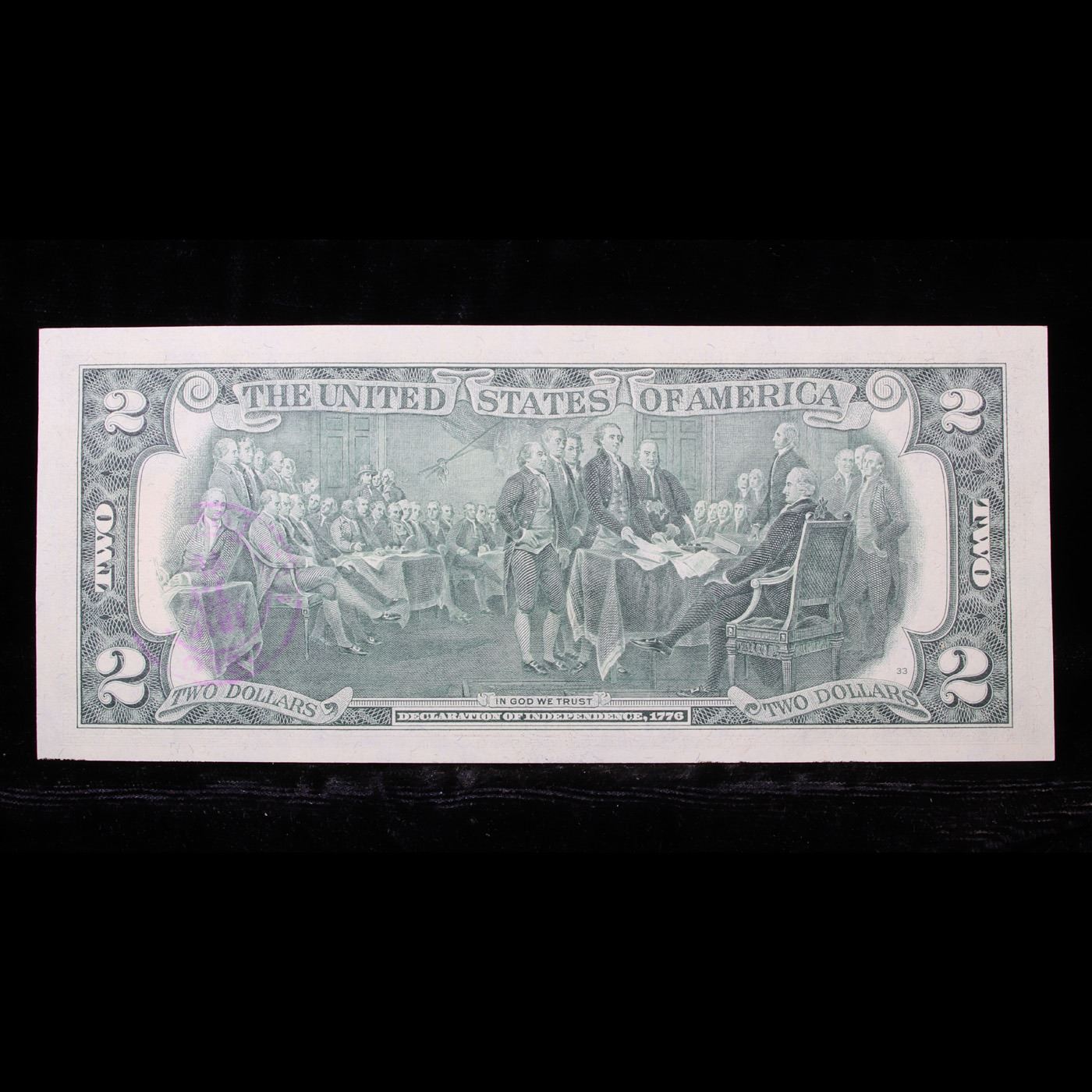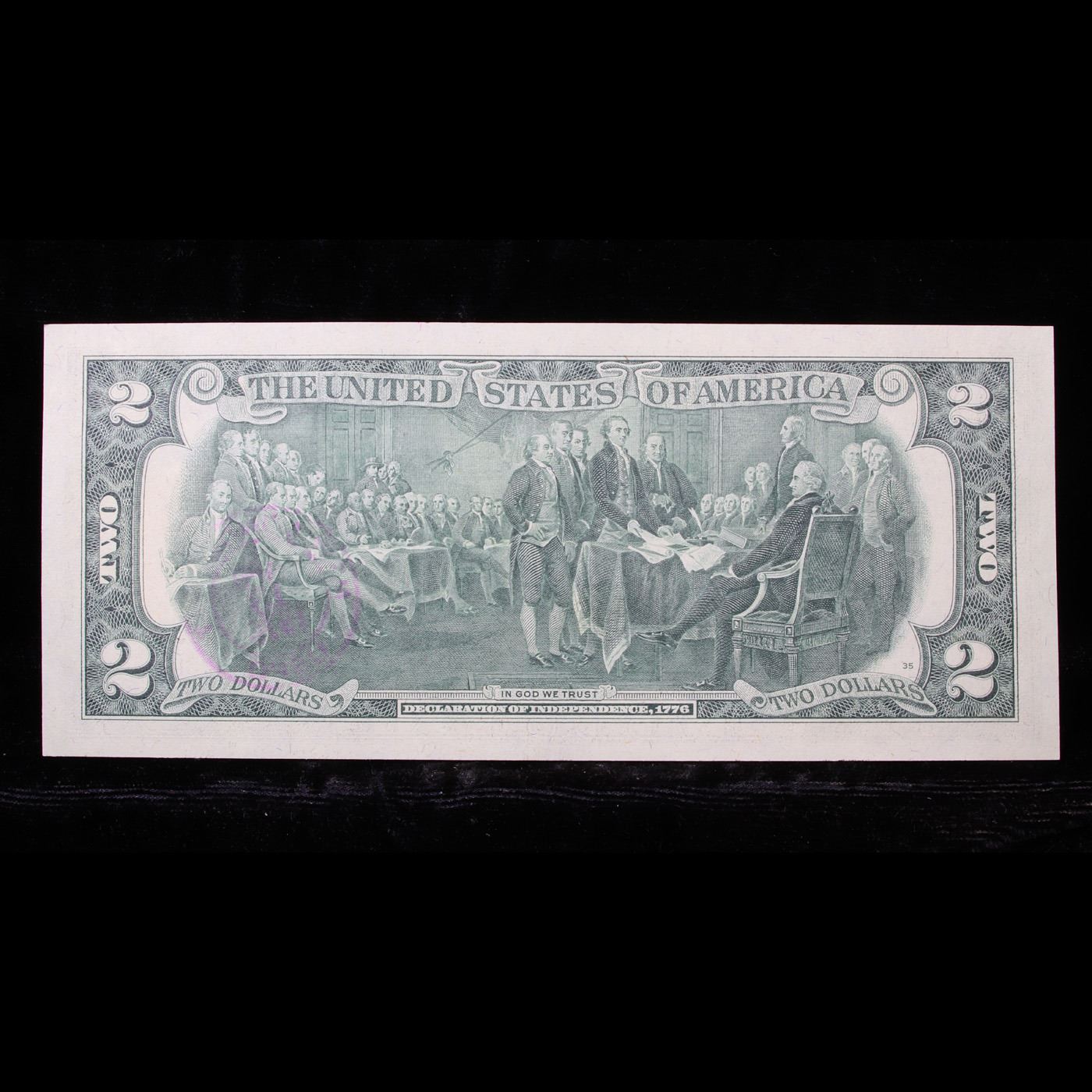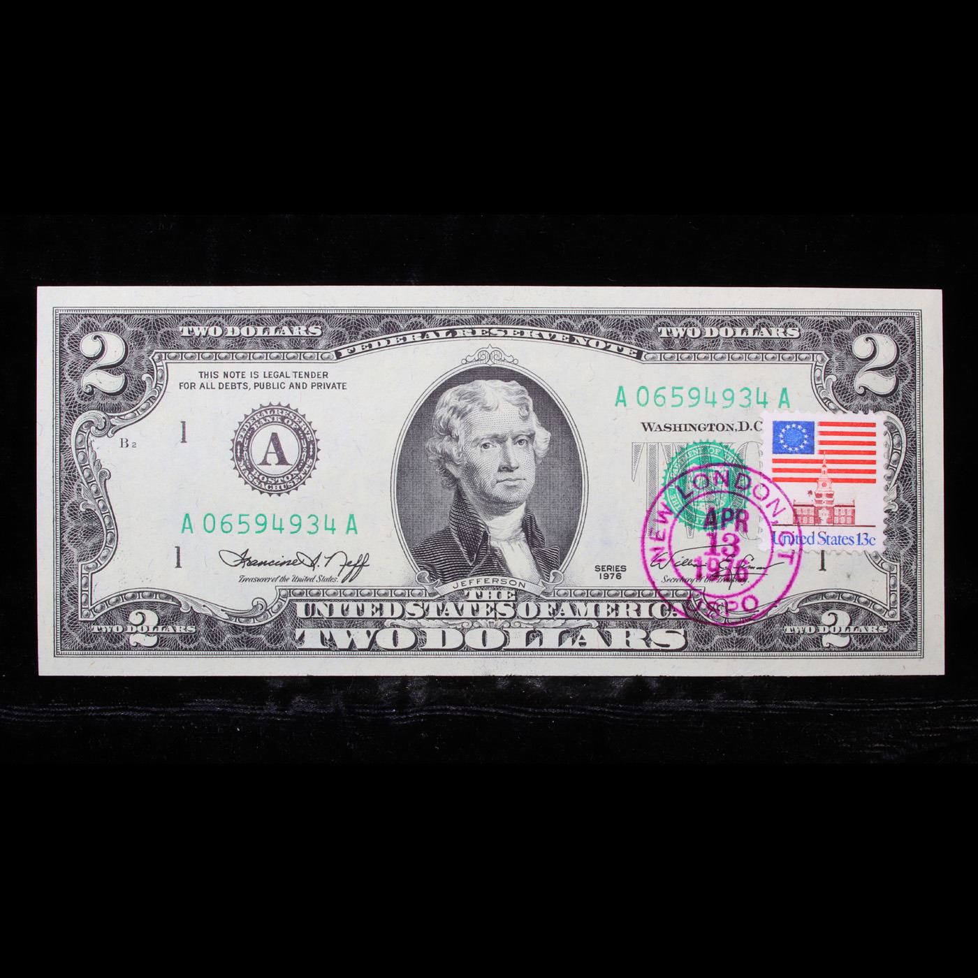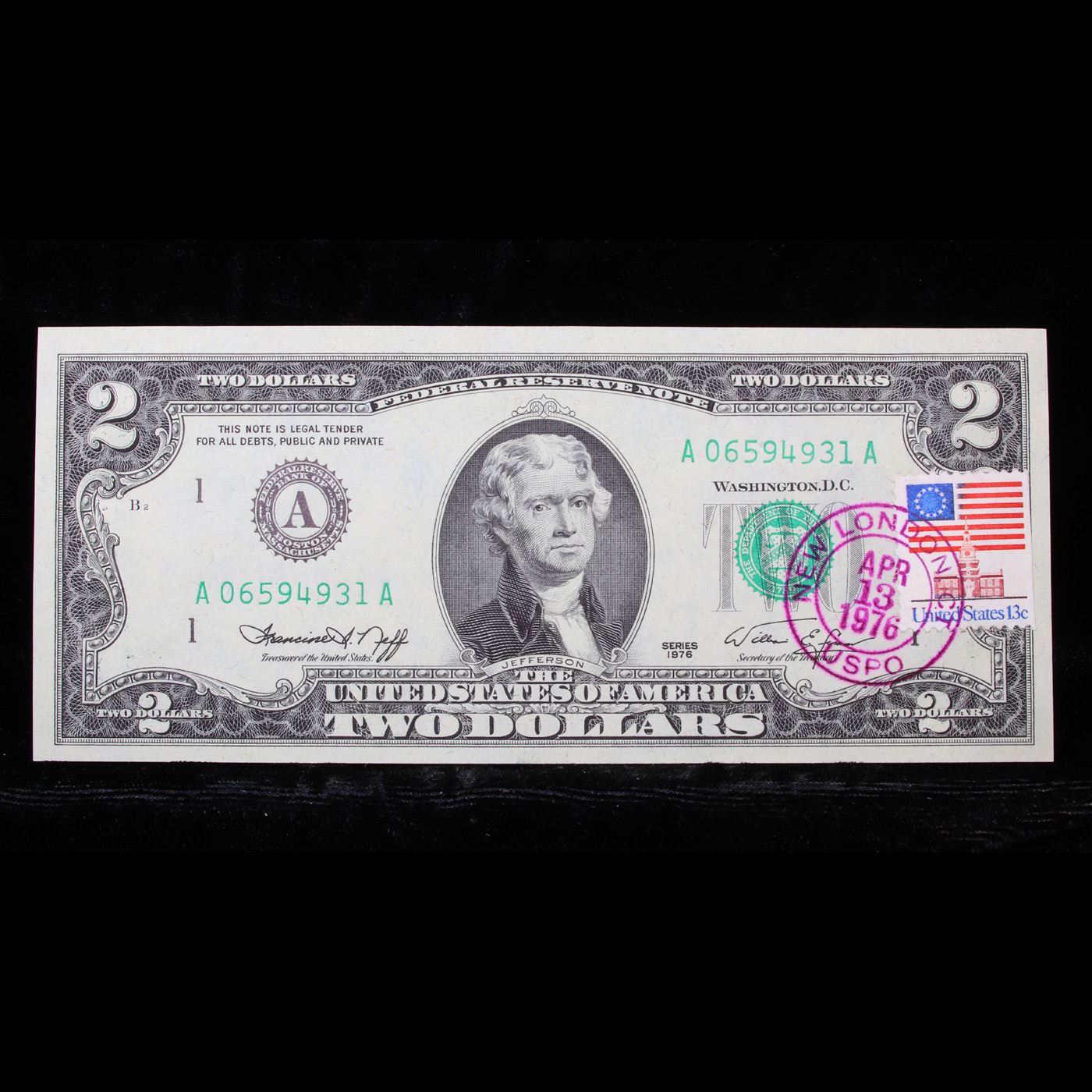 4x 1976 $2 Federal Reserve Note 1st Day of Issue, with Stamp Grades Gem CU. On April 13, 1976, to celebrate the bicentennial of American independence, new $2 Federal Reserve Notes were issued with backs featuring the well-known painting Signing of the Declaration of Independence. These Notes all have a 13c Stamp or 2 stamps totaling 13c hand canceled on April 13, 1976 for the first day of issue of the new $2 notes. These official first-day-of-issue Bicentennial notes will be historic additions to your collection (designs and locations of the 13¢ stamps will vary).