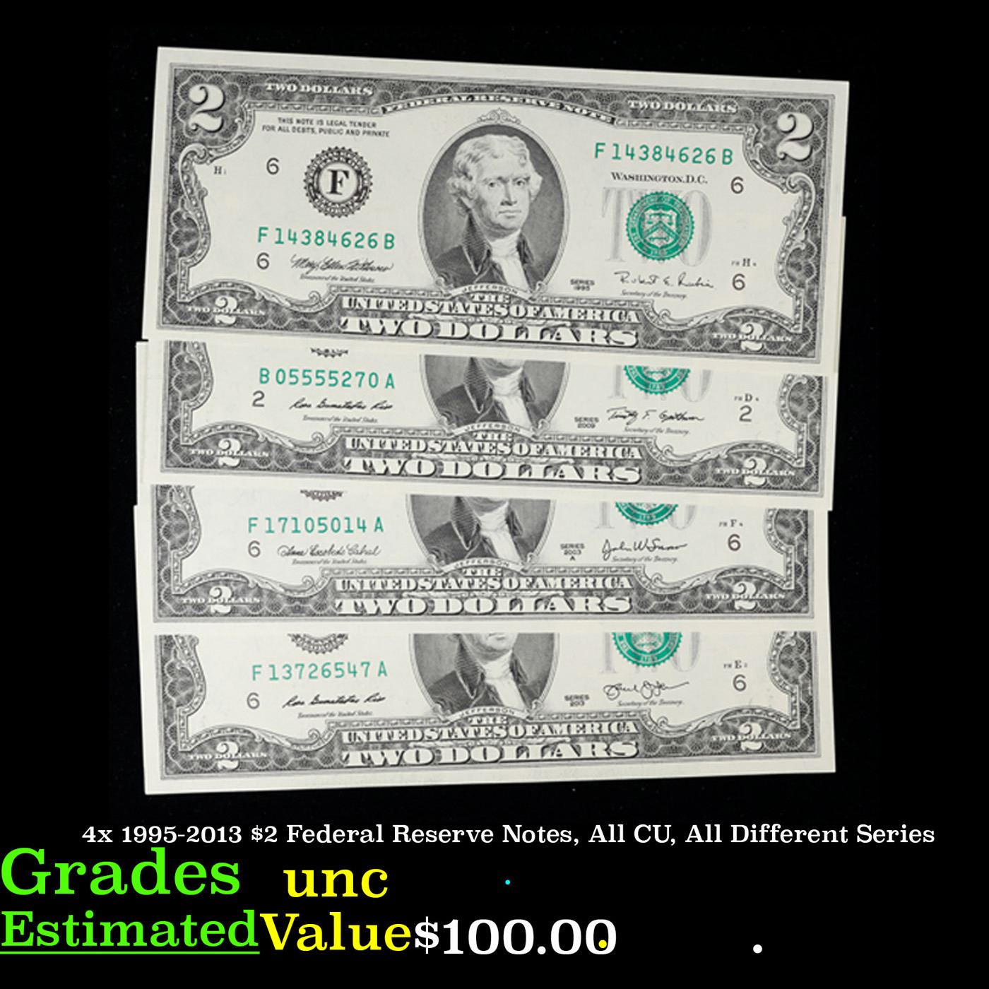 4x 1995-2013 $2 Federal Reserve Notes, All CU, All Different Series Grades Brilliant Uncirculated