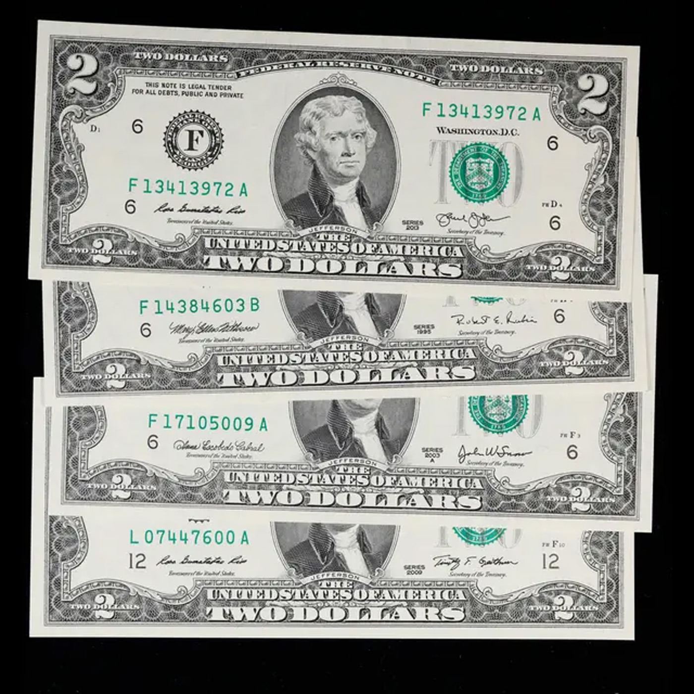 4x 1995-2013 $2 Federal Reserve Notes, All Different Series, All CU! Grades Brilliant Uncirculated.