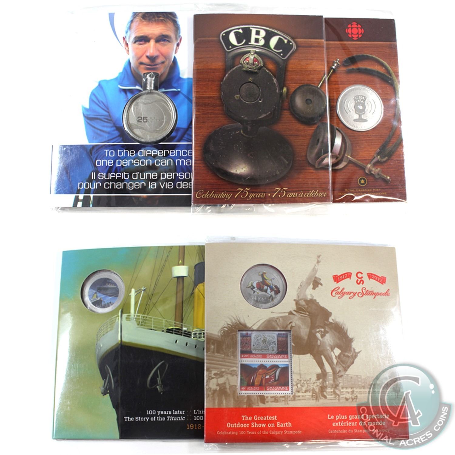 4x 2011-2012 Canada Commemorative 25-cent set/medallion. This lot includes: 2011 Rick Hansen 25th Anniversary relay Medallion, 2011 25-cent 75th Anniversary of CBC/Radio Canada, 2012 R.M.S Titanic 25-cent, and 2012 Canada 25-cent 100th years of the Calgary stampede coin and stamp set. 4pcs