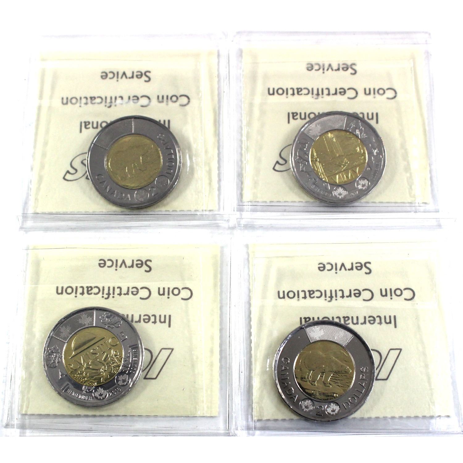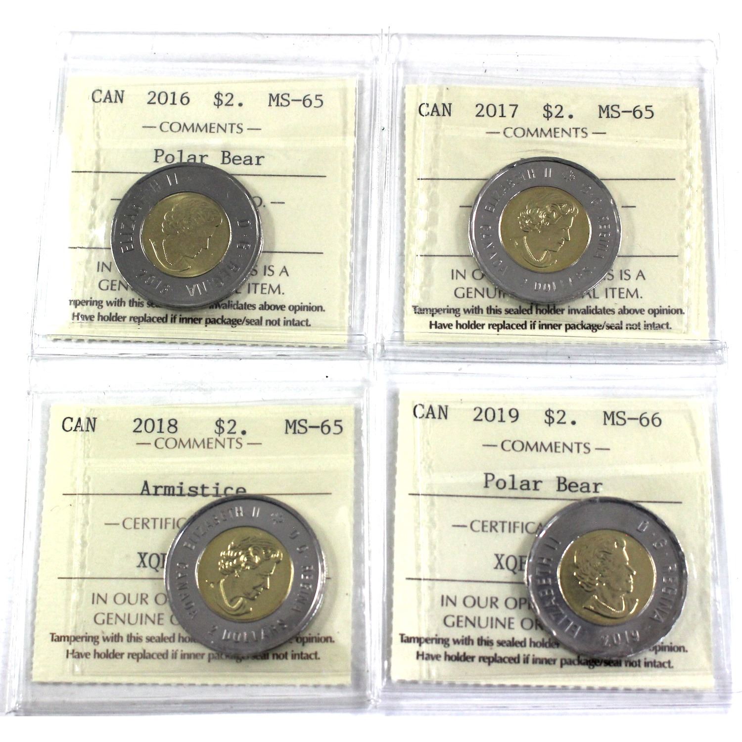 4x 2016-2019 Canada $2 ICCS Certified - 2016 MS-65, 2017 MS-65, 2018 Armistice MS-65 & 2019 MS-66. 4pcs