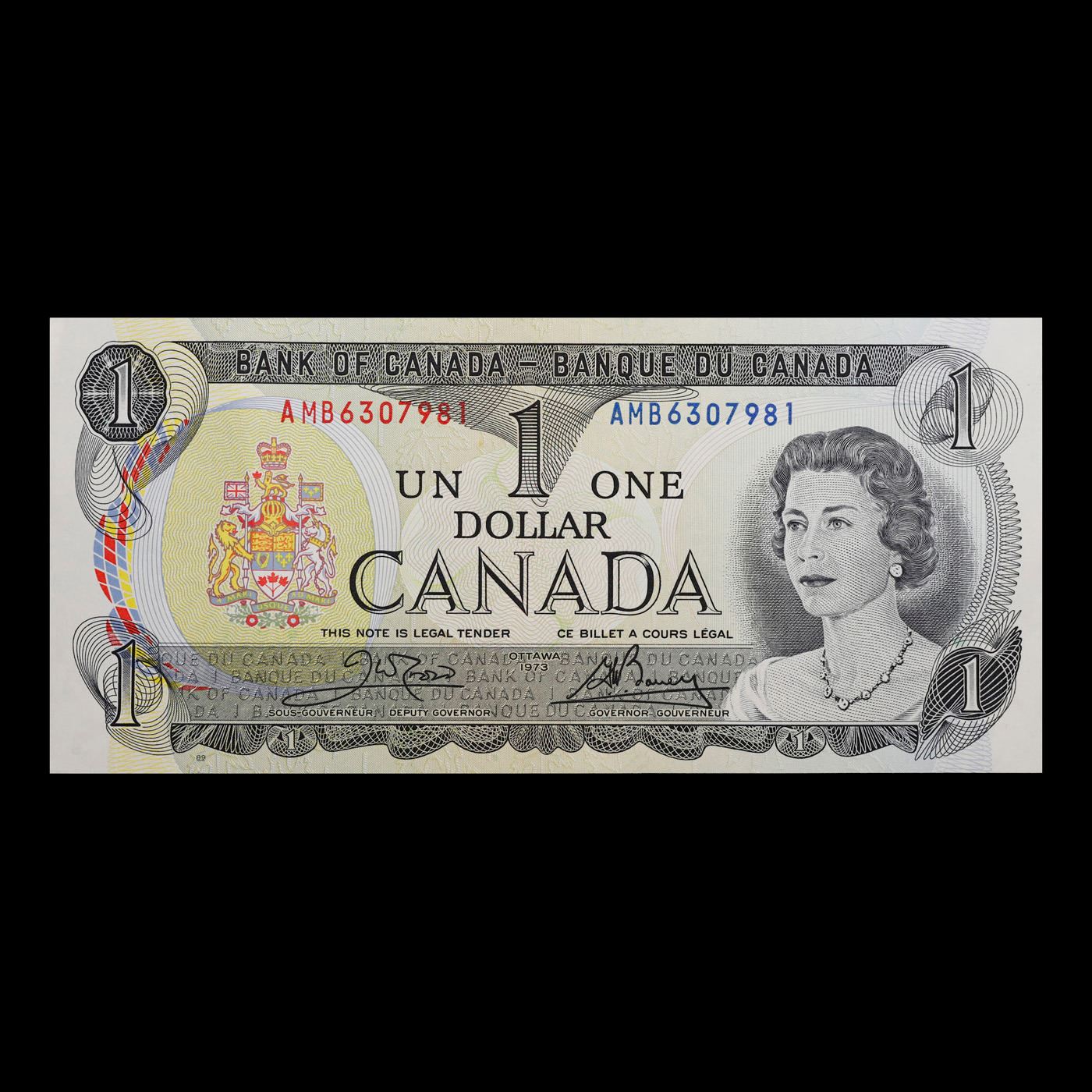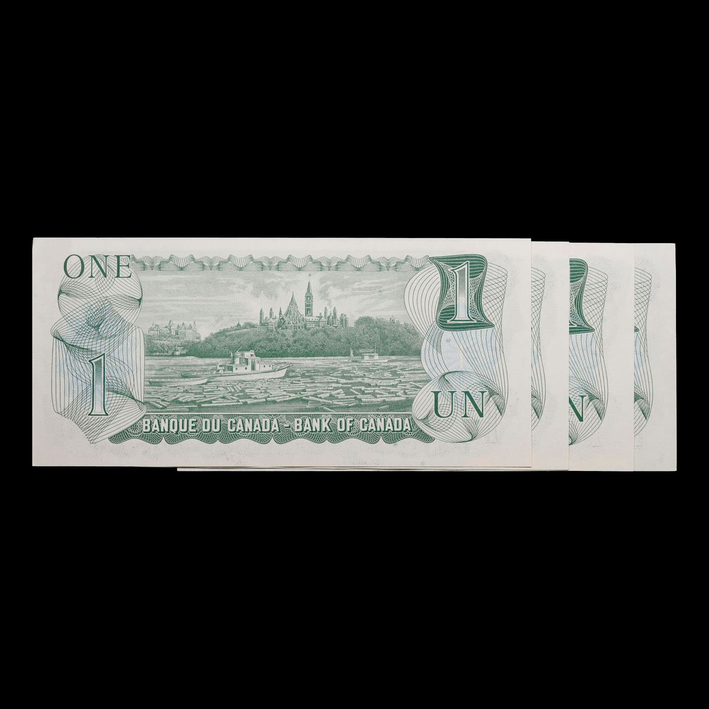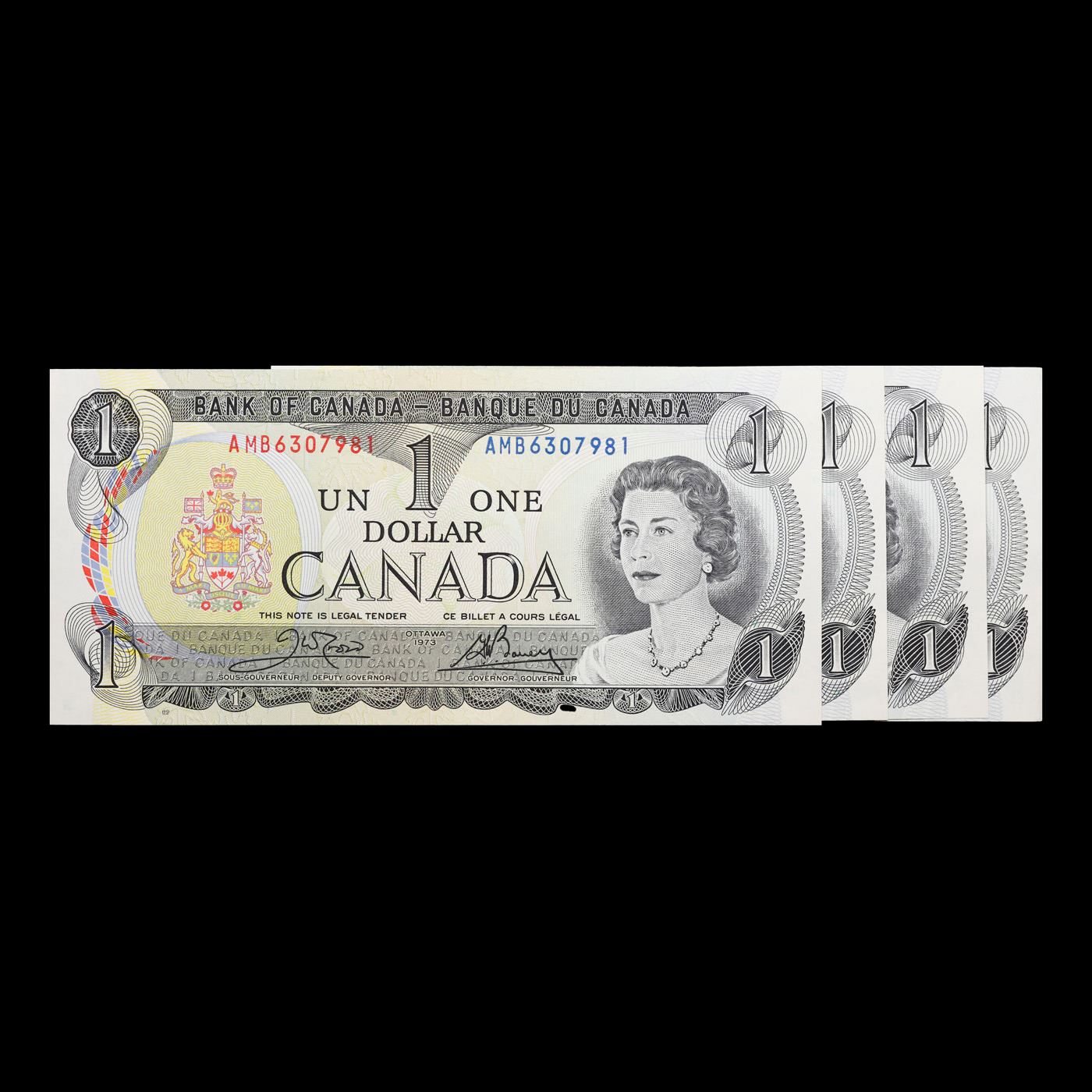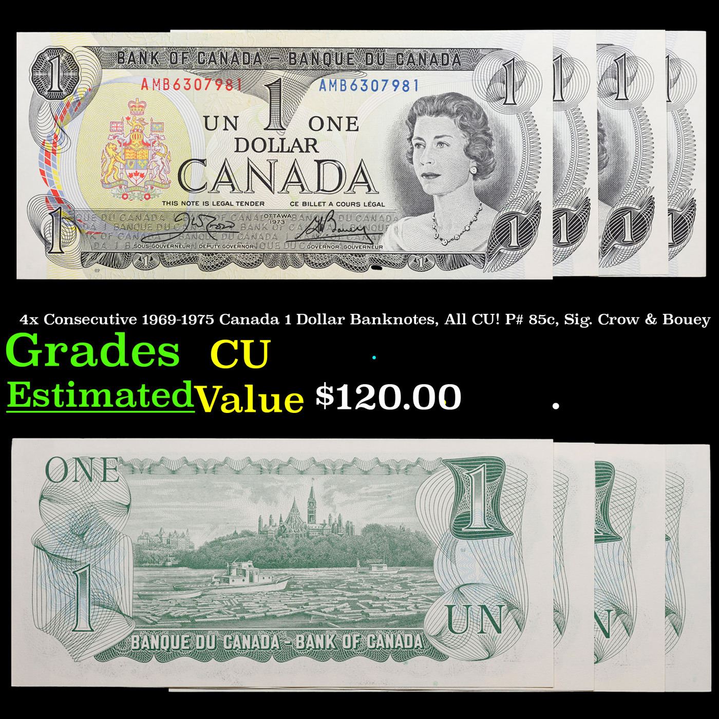 4x Consecutive 1969-1975 Canada 1 Dollar Banknotes, All CU! P# 85c, Sig. Crow & Bouey Grades CU