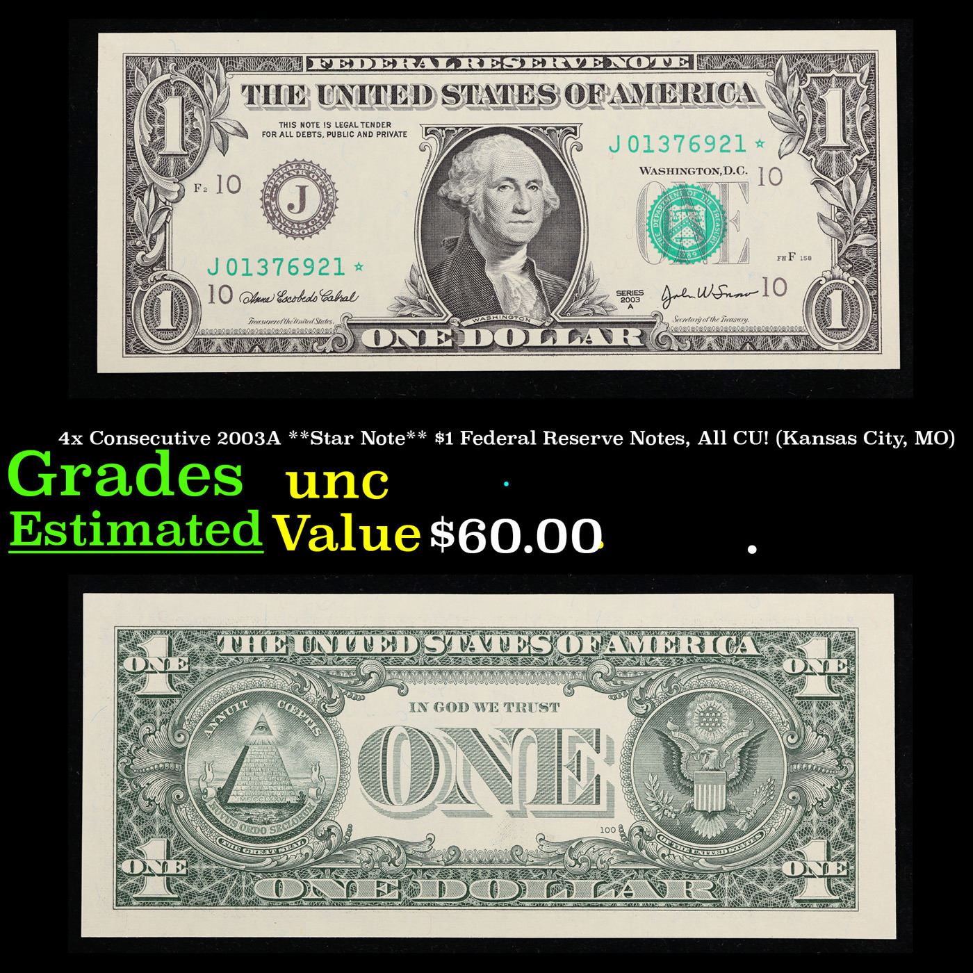 4x Consecutive 2003A **Star Note** $1 Federal Reserve Notes, All CU! (Kansas City, MO) Grades Brilli