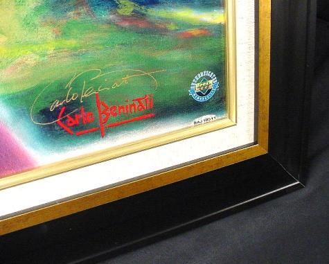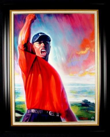 Entitled TIGER ROARS, this very prestigious limited edition museum quality fine art mixed media serigraph on canvas is personally signed by Tiger Woods and renowned sports artist Carlo Beninati! Tiger Woods is possibly the most sought after sport autograph in the world today! * Medium: Museum quality mixed media serigraph on canvasTitle: "Tiger Roars" * Image size: 29 1/2 x 39 1/2 inchesEdition: Numbered Printer's Proof, marked PP 7/25Autograph: Tiger Woods * Signed by Carlo BeninatiFraming: In gold and linen accented matte black laminate wood frameFrame size: 38 x 48 inchesPublisher: Midwest Estate BuyersCondition: Excellent * A unique opportunity to acquire one of the most sought after sports autographs in the world, signed prominently on a museum quality print created by a noted artist.