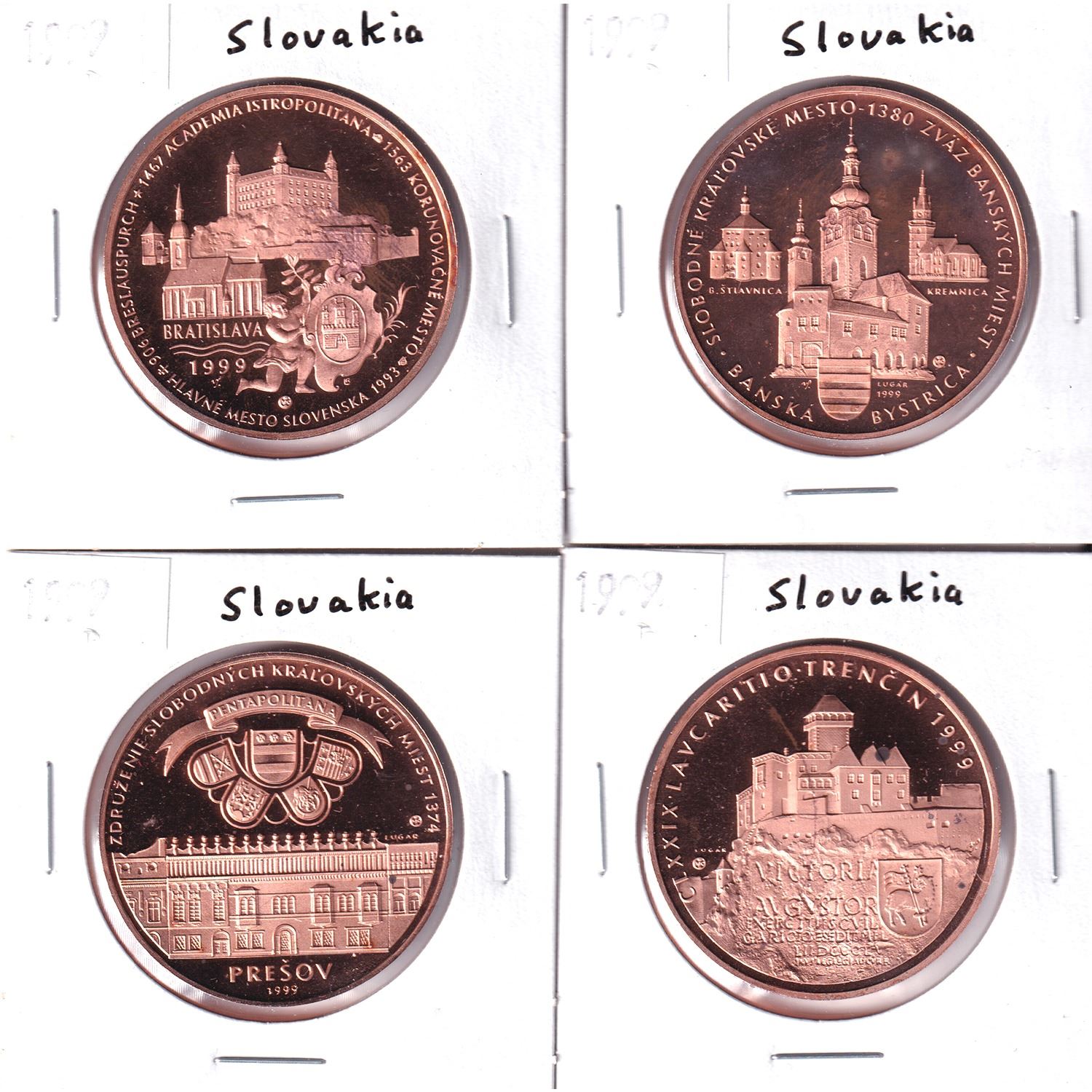 4x Slovakia 1999 Commemorative Medallions. Lot Includes: Banská Bystrica, Bratislava, Trencín, & Prešov. 4pcs.