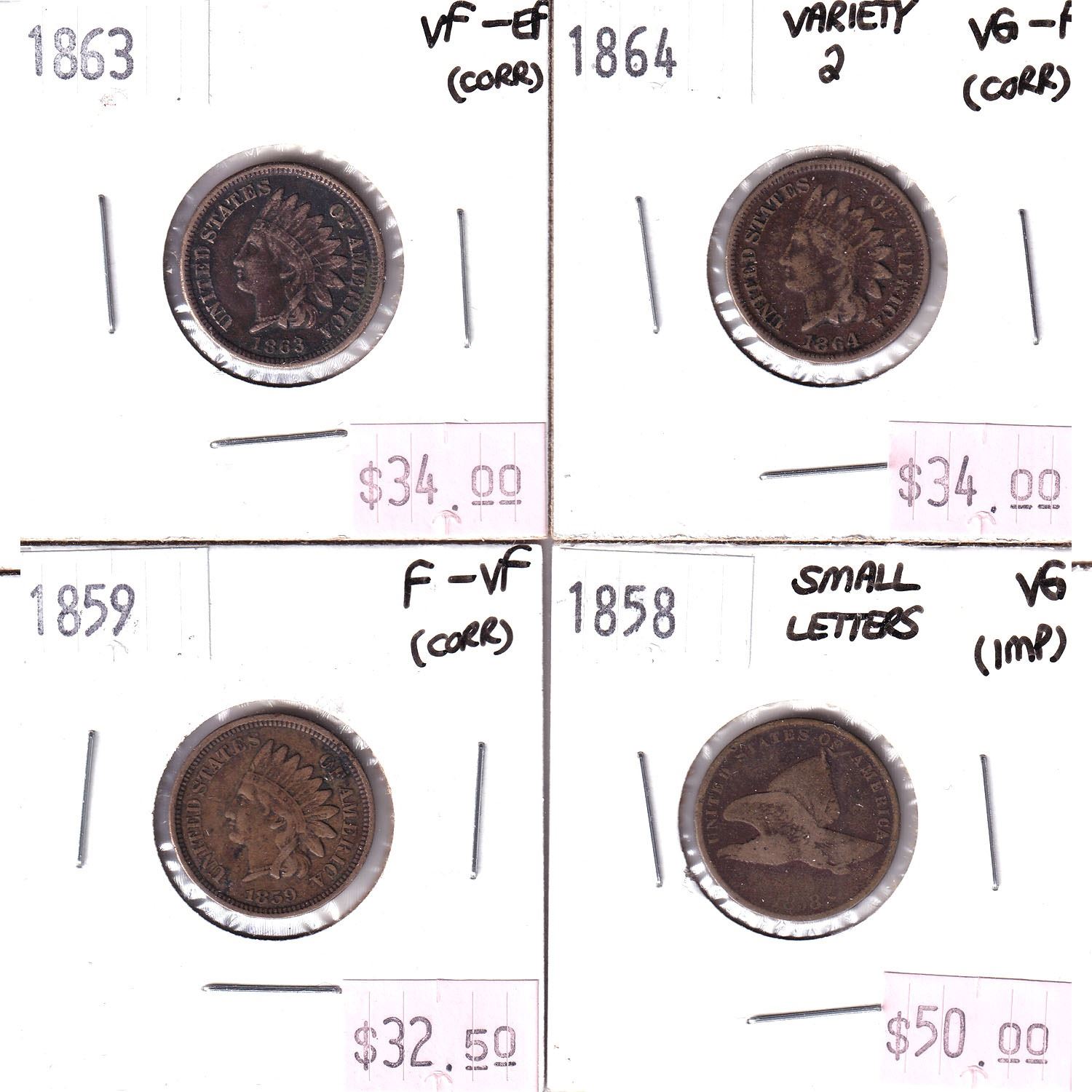 4x USA 1-cents. Lot includes 1863 VF-EF, 1864 Variety 2 VG-F, 1859 F-VF, & 1858 Small Letters VG. Coins are all impaired. Please View Images.