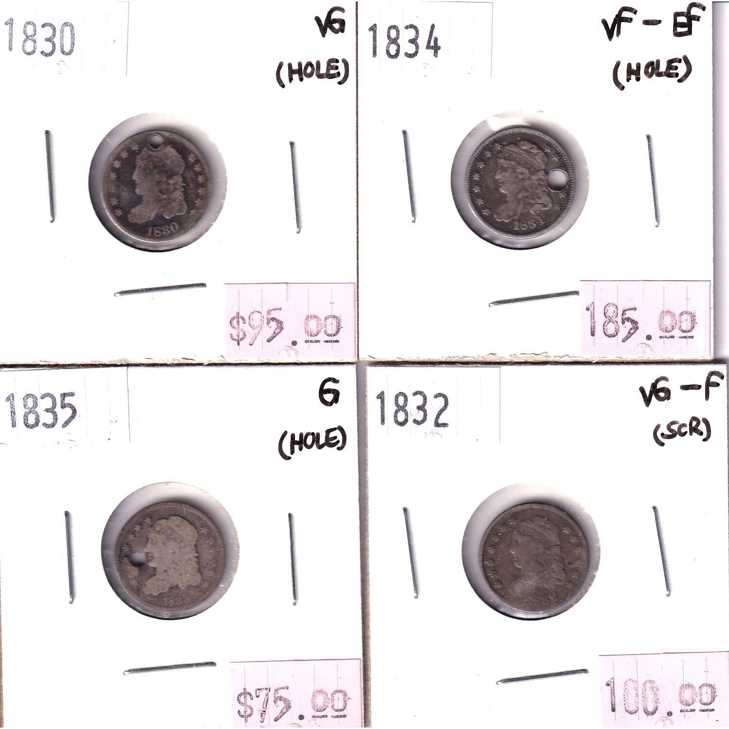 4x USA Silver 5-cents. Lot includes 1830 VG, 1832 VG-F, 1834 VF-EF, & 1835 G. All coins have been holed, please review image.