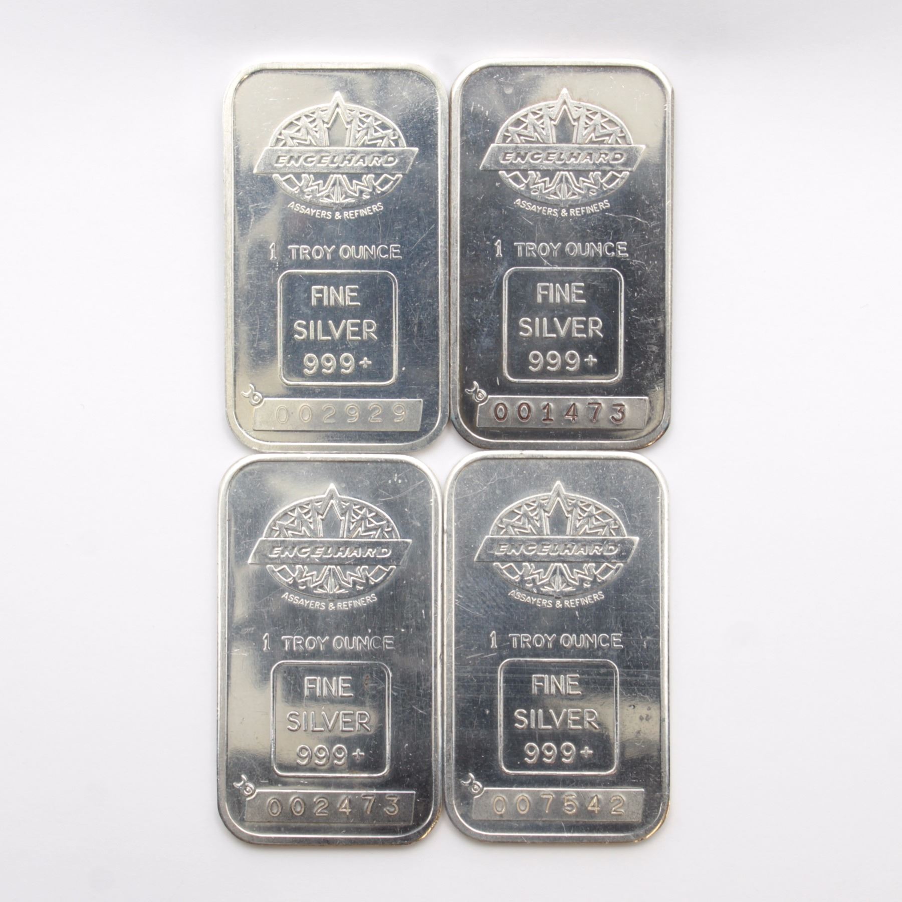 4x Vintage Engelhard 1oz Fine Silver Bars with 'Blank' Reverse (Tax Exempt) #007542, #002473, #002929, #001473. 4pcs.