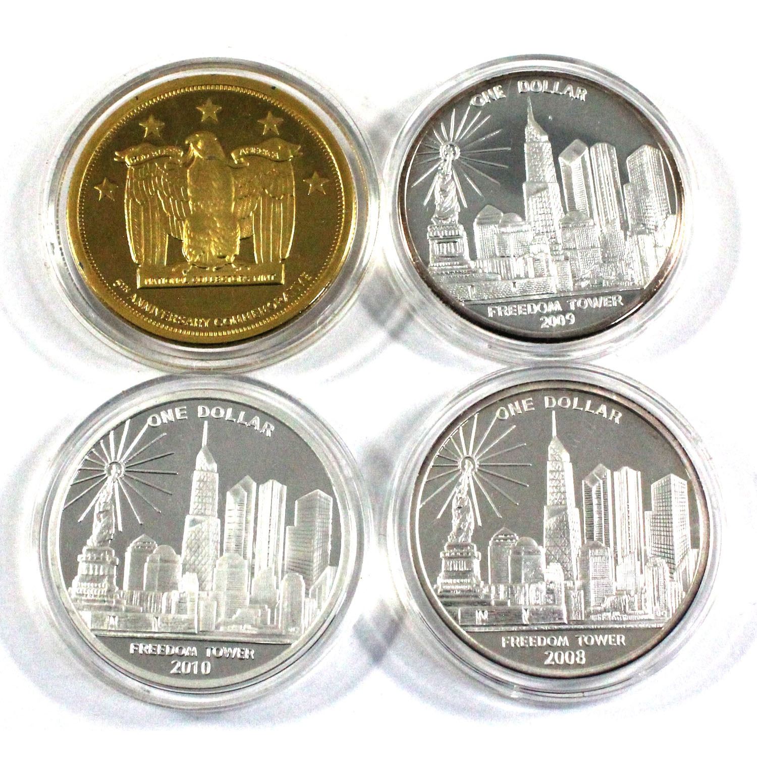 4x World trade Centre/Freedom tower Commemorative coins and Medal: Lot includes the 2001-2006 commemorative work trade Center medal, 2008 Cook Island Freedom Tower one dollar , 2009 Cook Island Freedom Tower one dollar and 2010 Cook Island Freedom Tower one dollar. 4pcs