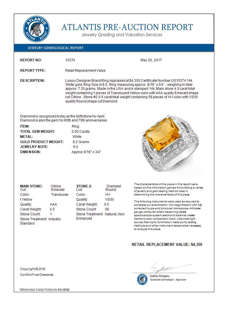 5.0 CTW Citrine & Diamond Ring 14K White Gold ---- Luxury Designer Brand Ring Appraised Retail Price at $4,350 ---- SKU Number US10374 14k White gold Ring Size is 6.5, Ring measuring approx. 9/16" x 3/4" , weighing in total approx. 7.35 grams. Made in the USA and is stamped 14k, Main stone 4.5 carat total weight containing 1 pieces of Translucent Yellow color with AAA quality Emerald shape cut Citrine , Stone #2 0.5 carat total weight containing 56 pieces of H-I color with VS/SI quality Round shape cut