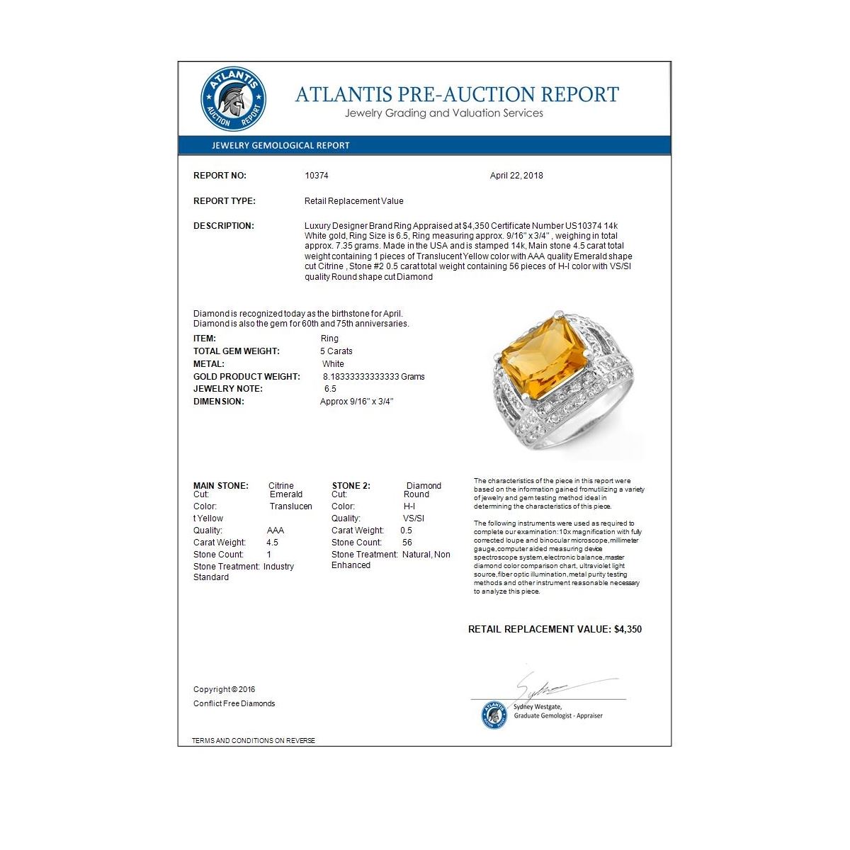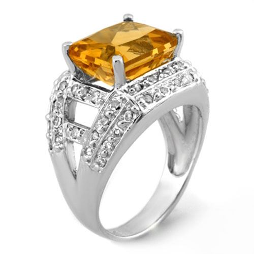 REF-71W8F -10374 ---- 5.0 CTW Citrine & Diamond Ring 14K White Gold ---- Luxury Designer Brand Ring Appraised at $4,350 Certificate Number US10374 14k White gold, Ring Size is 6.5, Ring measuring approx. 9/16" x 3/4" , weighing in total approx. 7.35 grams. Made in the USA and is stamped 14k, Main stone 4.5 carat total weight containing 1 pieces of Translucent Yellow color with AAA quality Emerald shape cut Citrine , Stone #2 0.5 carat total weight containing 56 pieces of H-I color with VS/SI quality Round shape cut Diamond