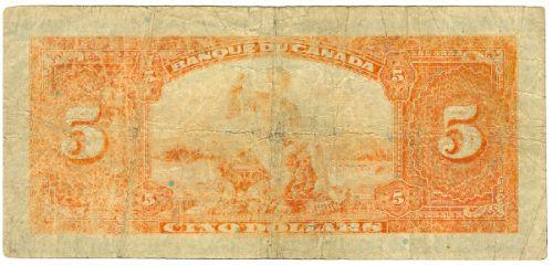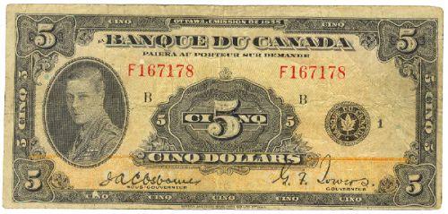 Bank of Canada; $5.00 1935 French Note, BC-6, Choice Fine, signature Osborne-Towers, serial # F167178.
