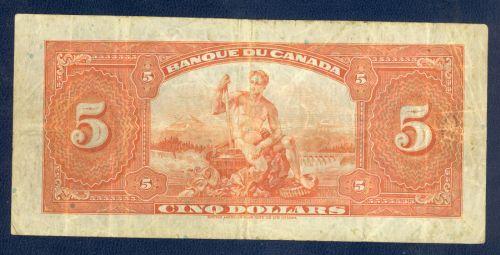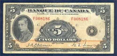 Bank of Canada; $5.00 1935 French note, BC-6, choice Fine, signature Osborne-Towers, serial # F008186. Some faint markings on the right of reverse.