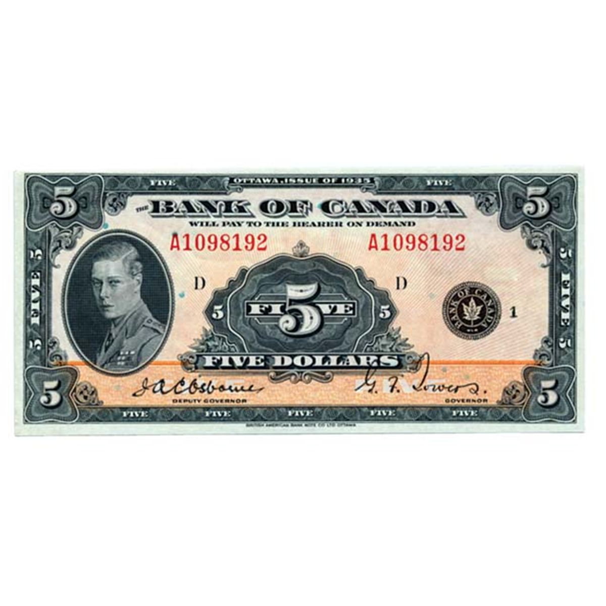 $5.00. 1935 Issue. BC-5. English Text. No. A1098192/D. PMG graded UNC-63 EPQ. Scarce in uncirculated.