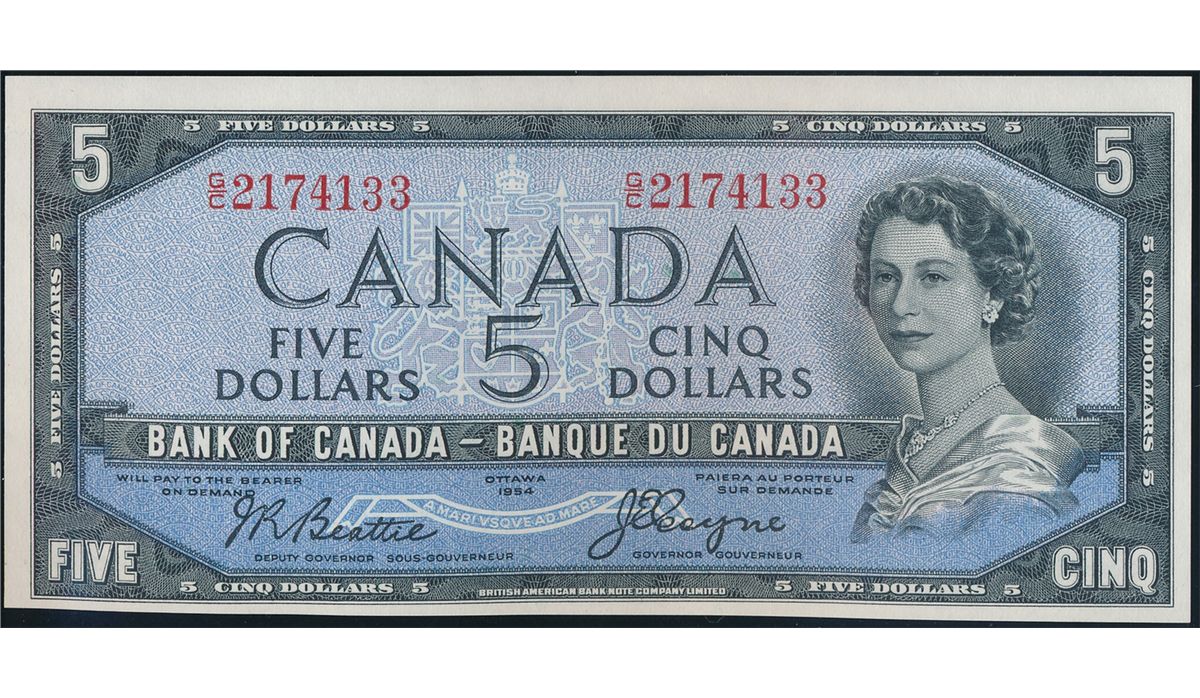 $5.00. 1954 Issue. BC-31b. No. G/C2174133. Beattie-Coyne. 'Devil's Fave' Unc.