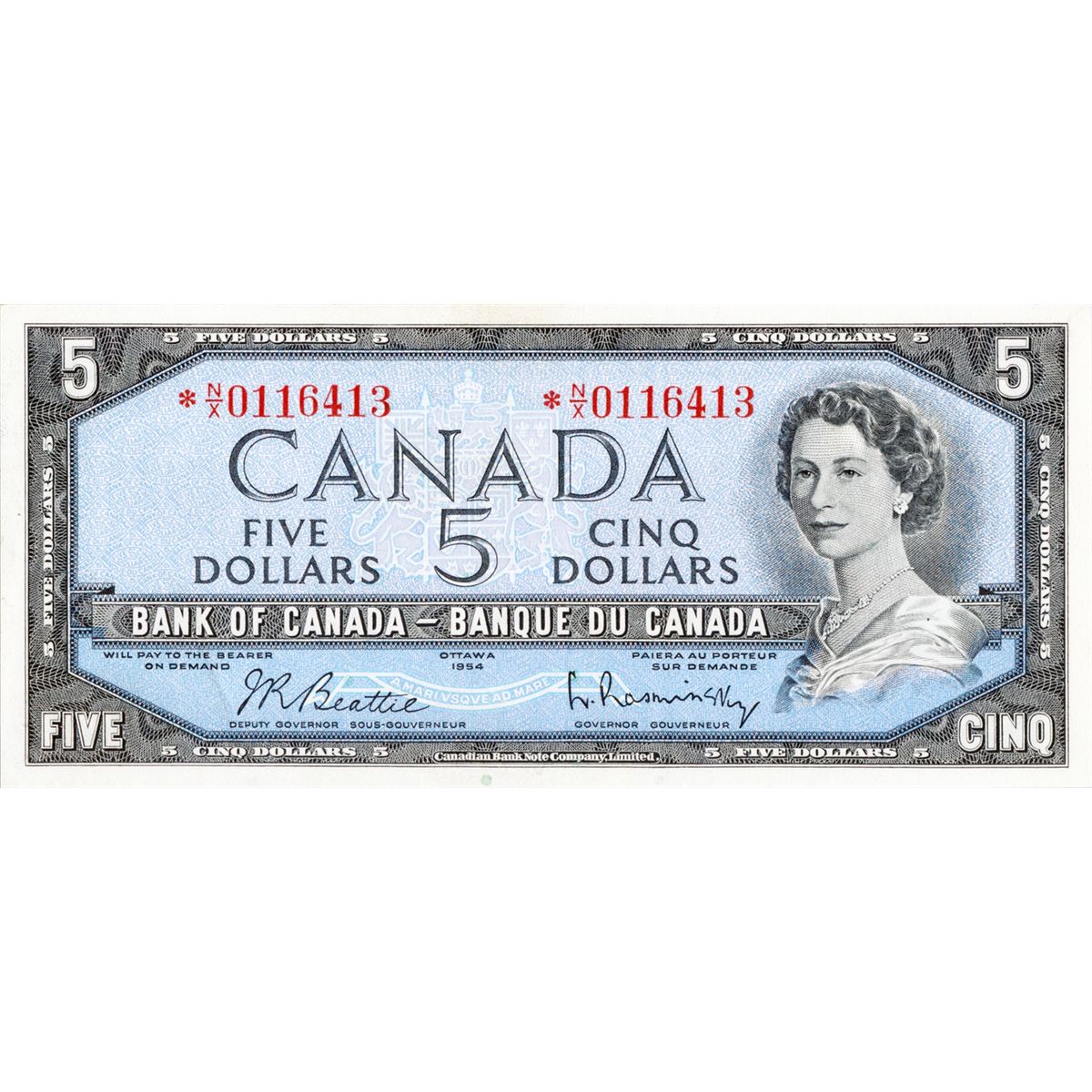 $5.00. 1954 Issue. BC-39bA. Modified. Beattie-Rasminsky. No. *N/X0116413. Extra Fine+.