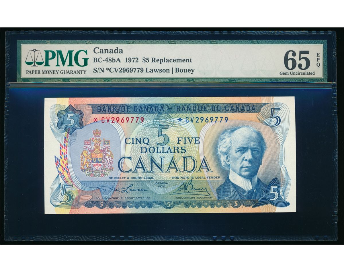 $5.00. 1972. BC-48bA. Lawson-Bouey. Replacement Note. No.*CV2969779. PMG graded Gem Uncirculated-65 EPQ.