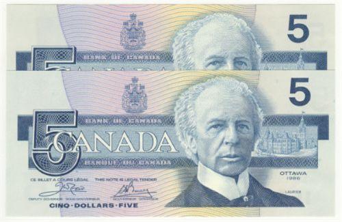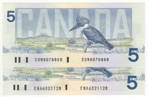 Bank of Canada; $5.00 1986, BC-56a, AU/UNC, signature; Crow Bouey, serial; ENA6321128, Yellow B.P.N.. $5.00 1986, BC-56a-i, UNC, signature; Crow Bouey, serial; EON8078888, Blue B.P.N.. Lot of 2 notes.
