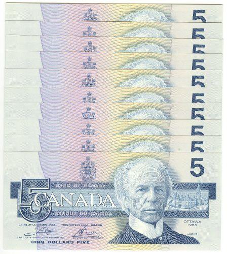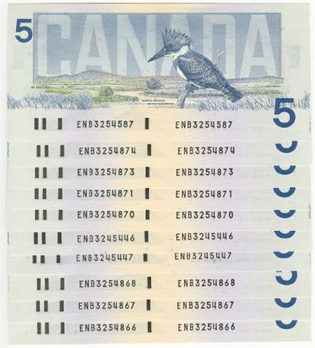 Bank of Canada; $5.00 1986, BC-56a, UNC, signature; Crow Bouey, serial; ENB, Yellow B.P.N.. Lot of 10 notes.