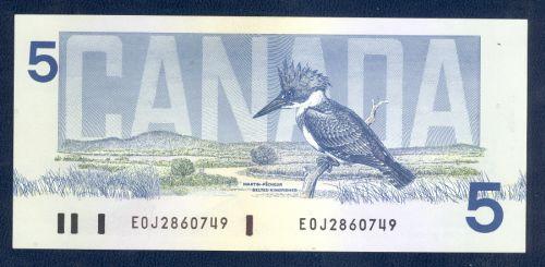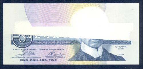 Bank of Canada; $5.00 1986, BC-56a-i, UNC, signature Crow Bouey, serie # EOJ2860749 Blue B.P.N..Printing error, the upper half of the last printing pass is missing making Laurier look decapitated. 50% missing.