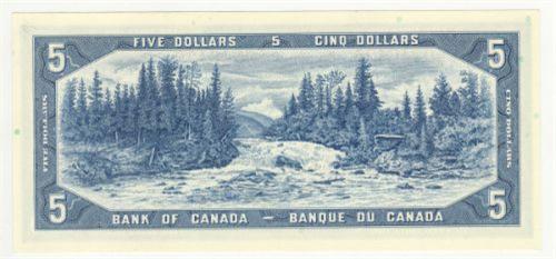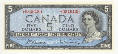 Bank of Canada; $5.00 4 digit radar note 1954, BC-39b, UNC, signature; Beattie Rasminsky, serial; I/X0346430.