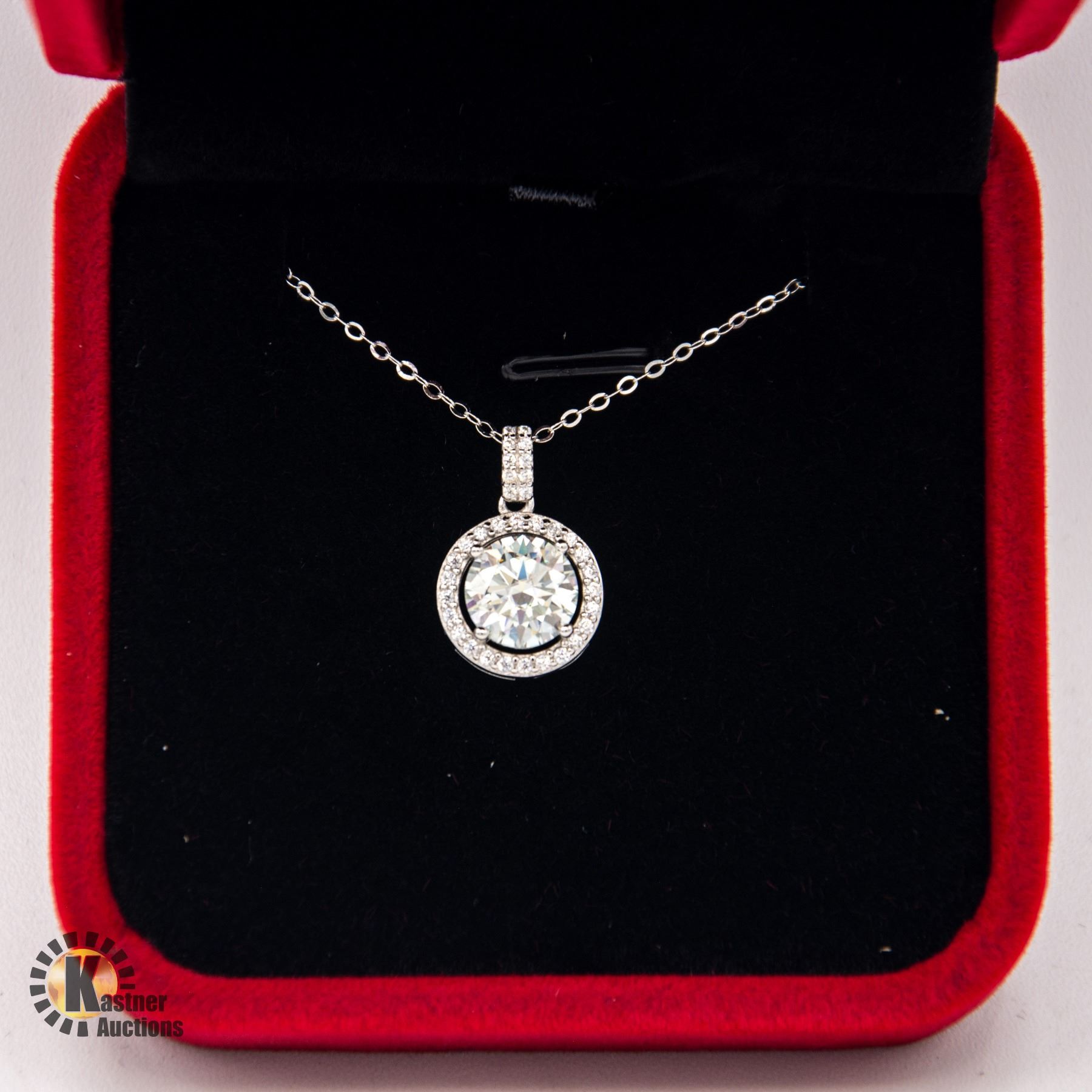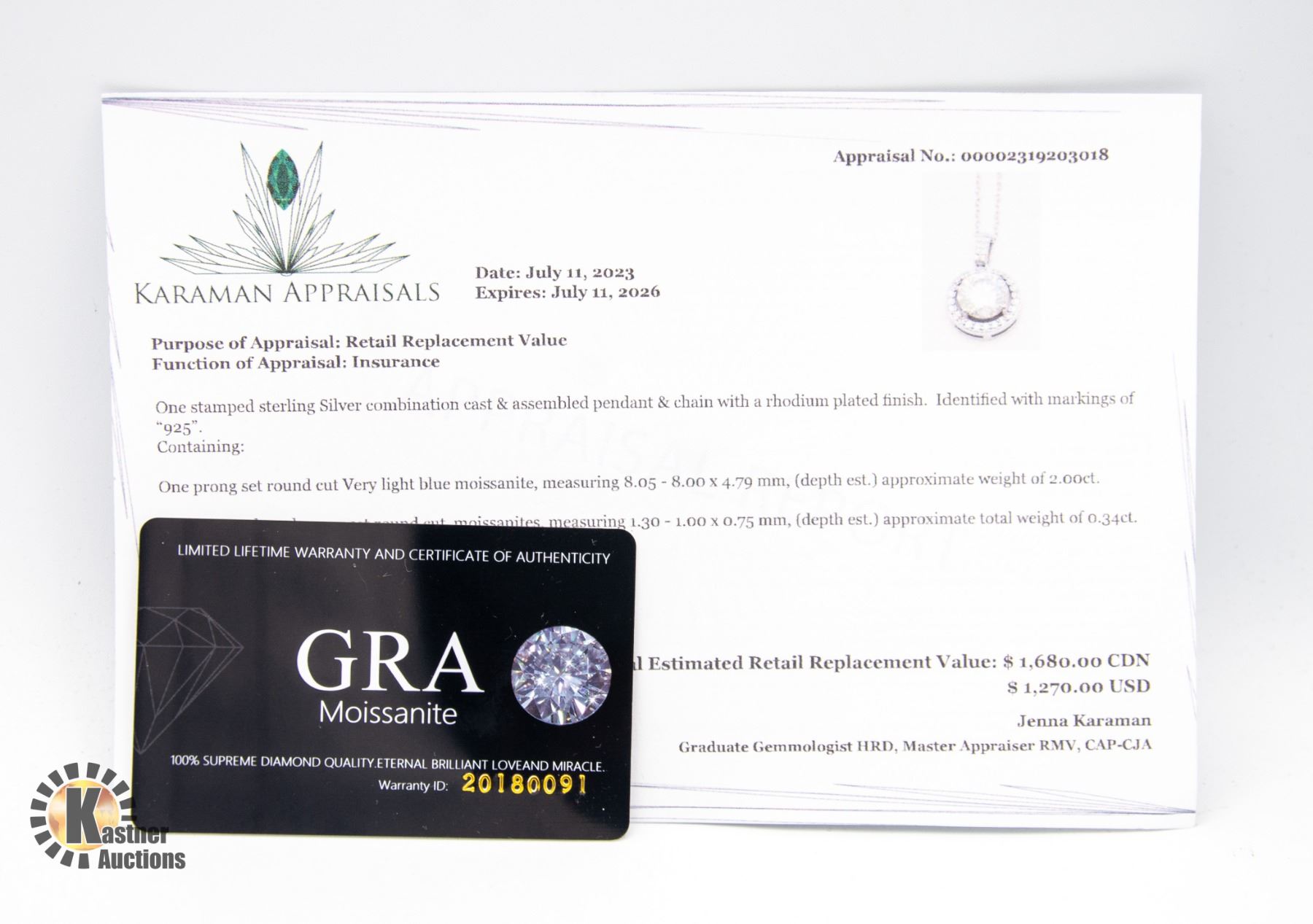 HALO OF 45 MOISSANITE STONES AS WELL AS IN BAIL. "THESE WEIGH A TOTAL 0.44 CT." SET IN STERLING SILVER PENDANT GRA CERTIFIED APPRAISED VALUE $3,340.00 **ALL ITEMS MUST BE REMOVED BY 5PM SATURDAY, SEPTEMBER 9TH 2023. ALL REMAINING ITEMS WILL BE SUBJECT TO A $6.00 PER DAY STORAGE CHARGE. ANY ITEMS REMAINING AFTER MONDAY, SEPTEMBER 25TH, 2023 WILL BE CONSIDERED FORFEITED. NO REFUNDS WILL BE ISSUED FOR FORFEITED ITEMS. TO SCHEDULE A PICK UP APPOINTMENT CLICK HERE