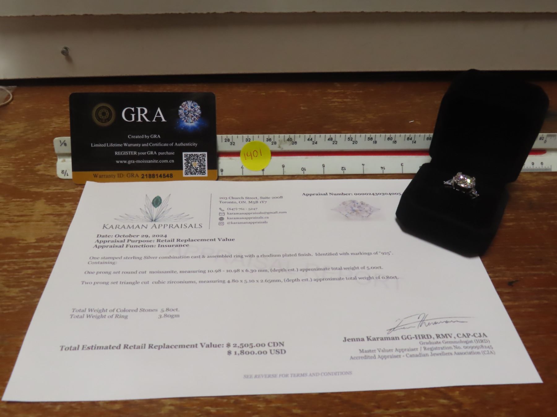 [SIZE 7] - ROUND BRILLIANT CUT MOISSANITE STONE VVS D COLOR SET IN 8 CLAW HEAD WITH 2 TRIANGLE SHAPED CUBIC ZIRCONIA SET IN 925 SILVER RING RETAIL VALUE $2,505.00