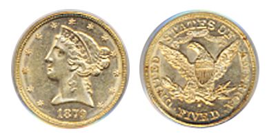 1879-S. PCGS graded AU-58. A slightly scarcer, near mint state example.