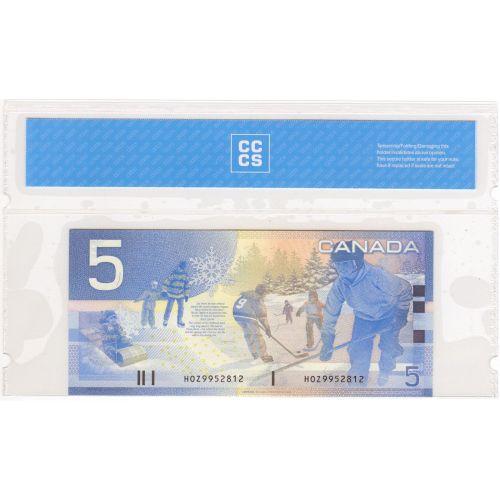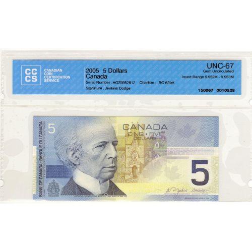 Bank of Canada, $5.00 Insert note 2005, graded CCCS UNC-67, Charlton # BC-62bA, signature Jenkins Dodge, serial HOZ9952812, insert range 9.952M - 9.953M. Unlisted in Charlton but recognized with only 8 notes reported so far, one of the toughest insert note. Problem free notes.