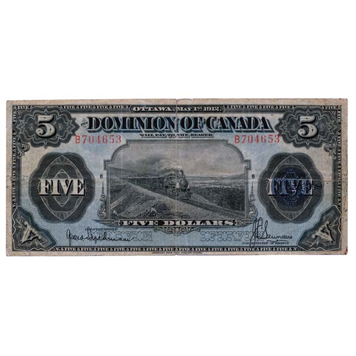 $5.00. May 1, 1912. DC-21e. No. B704653/B. PMG graded Net Fine-12.