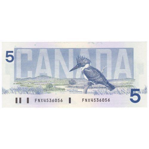 Bank of Canada, $5.00 Replacement note 1986, grade Gem UNC, Charlton # BC-56bA, signature Thiessen Crow, serial FNX4536056, Large F, Below 7.08M. Problem free note.
