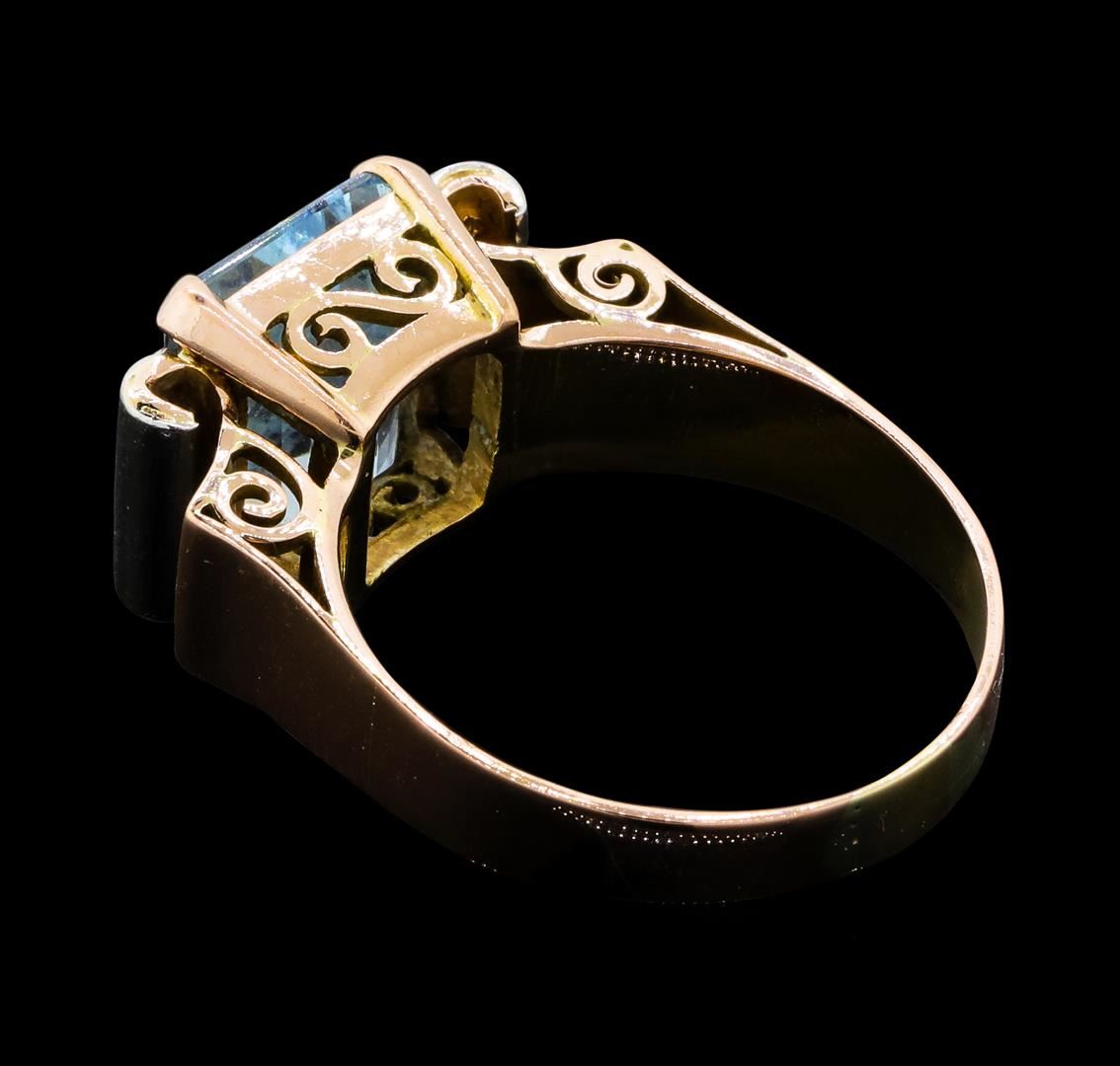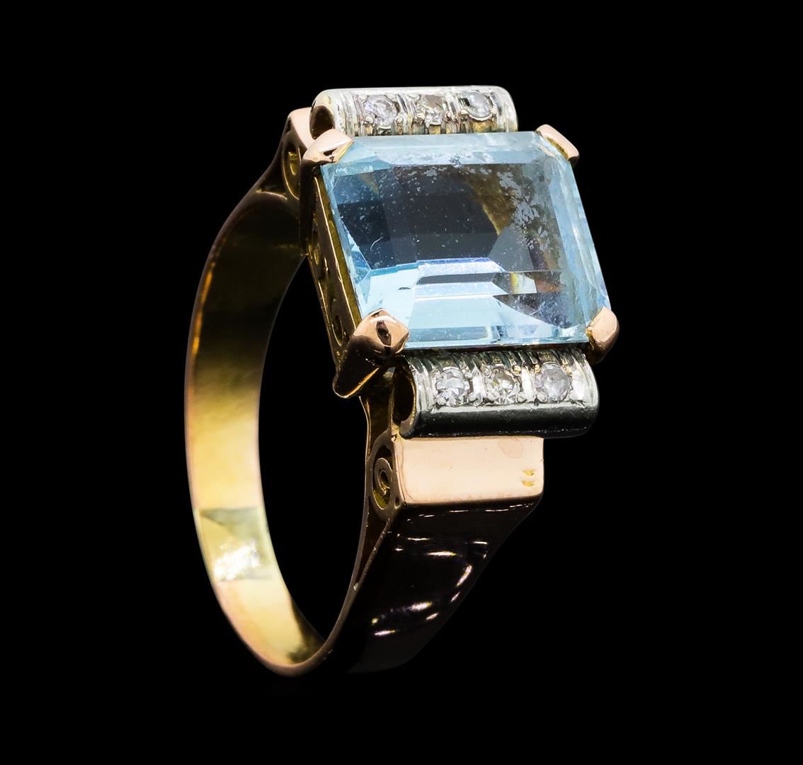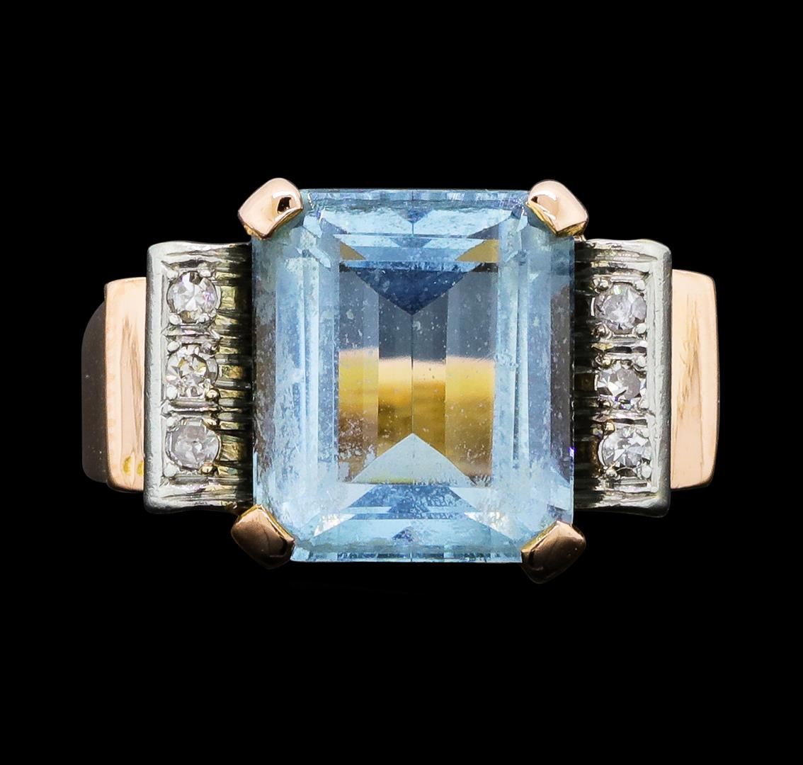 One lady's ring featuring: 14KT yellow gold with rose plating weighing 6.3 grams containing one aquamarine weighing 5.75ct and diamonds weighing 0.05ctw.
