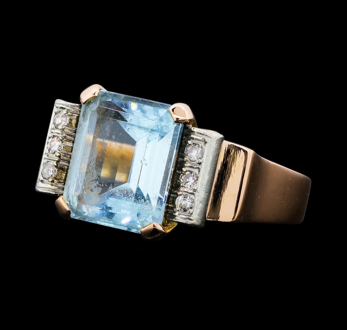 One lady's ring featuring: 14KT yellow gold with rose plating weighing 6.3 grams containing one aquamarine weighing 5.75ct and diamonds weighing 0.05ctw.