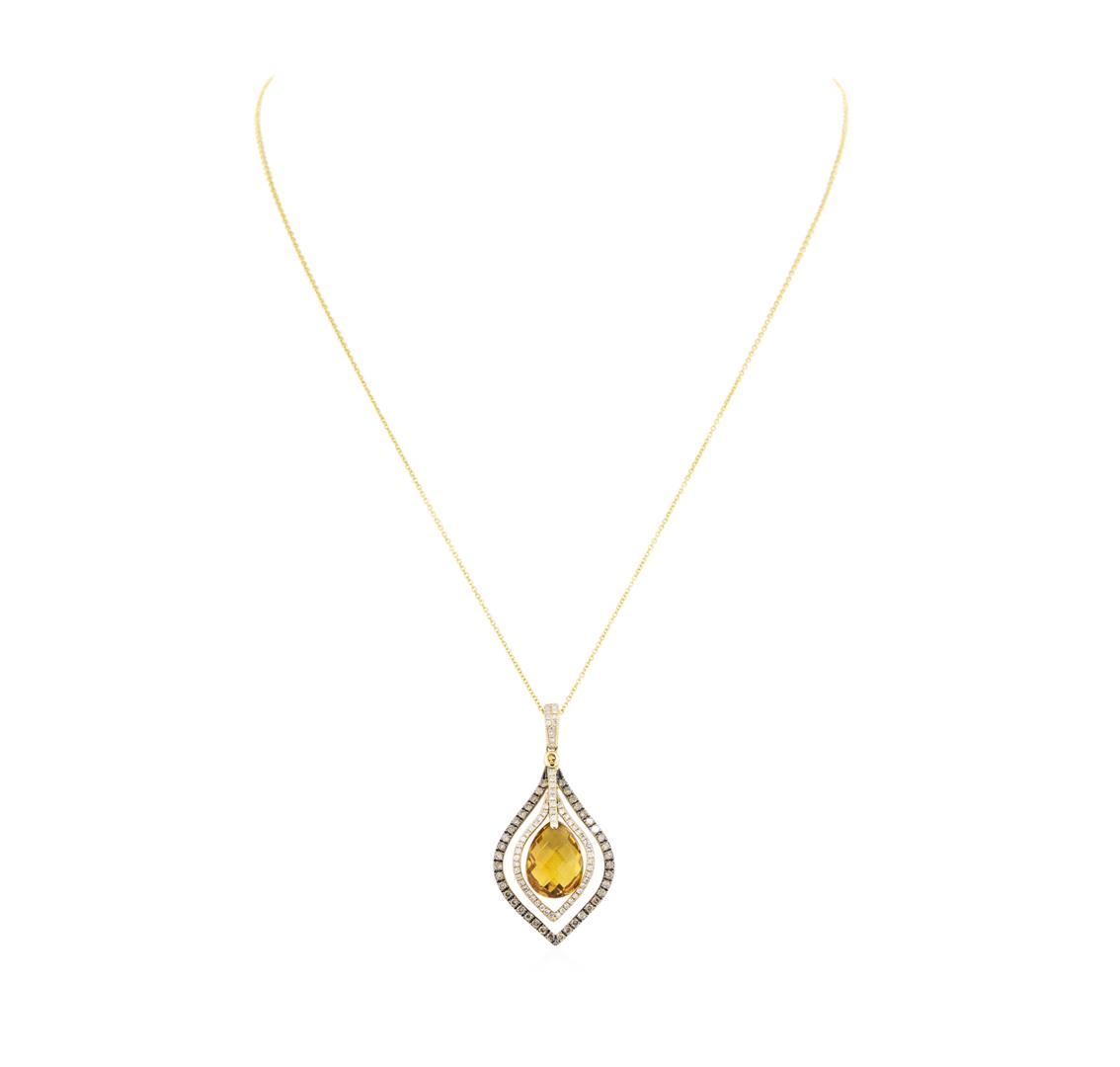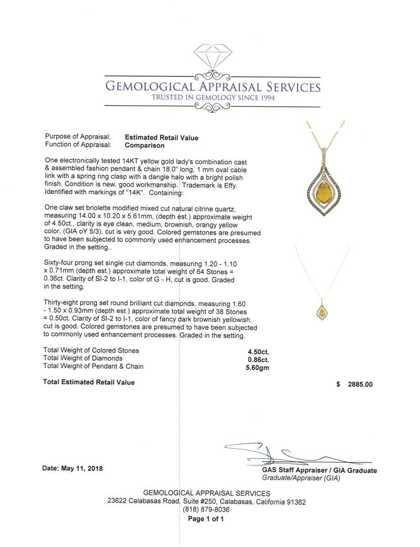 One electronically tested 14KT yellow gold lady's combination cast & assembled fashion pendant & chain 18.0' long, 1 mm oval cable link with a spring ring clasp with a dangle halo with a bright polish finish. Trademark is Effy. Identified with markings of '14K'. Condition is new, good workmanship. Containing: One claw set briolette modified mixed cut natural citrine quartz, measuring 14.00 x 10.20 x 5.61mm, (depth est.) approximate weight of 4.50ct., clarity is eye clean, medium, brownish, orangy yellow color, (GIA oY 5/3), cut is very good. Colored gemstones are presumed to have been subjected to commonly used enhancement processes. Graded in the setting. Sixty-Four prong set single cut diamonds, measuring 1.20 - 1.10 x 0.71mm (depth est.) approximate total weight of 64 Stones = 0.36ct. Graded in the setting. Color G - H Clarity SI-2 to I-1 Cut Good Thirty-Eight prong set round brilliant cut diamonds, measuring 1.60 - 1.50 x 0.93mm (depth est.) approximate total weight of 38 Stones = 0.50ct. Colored gemstones are presumed to have been subjected to commonly used enhancement processes. Graded in the setting. Color Fancy Dark Brownish Yellowish Clarity SI-2 to I-1 Cut Good. Total Weight of Colored Stones 4.50ct.. Total Weight of Diamonds 0.86ct.. Total Weight of Pendant & Chain 5.60gm GAS Appraised at $2885.00. GAS Appraised at $2,885.00.