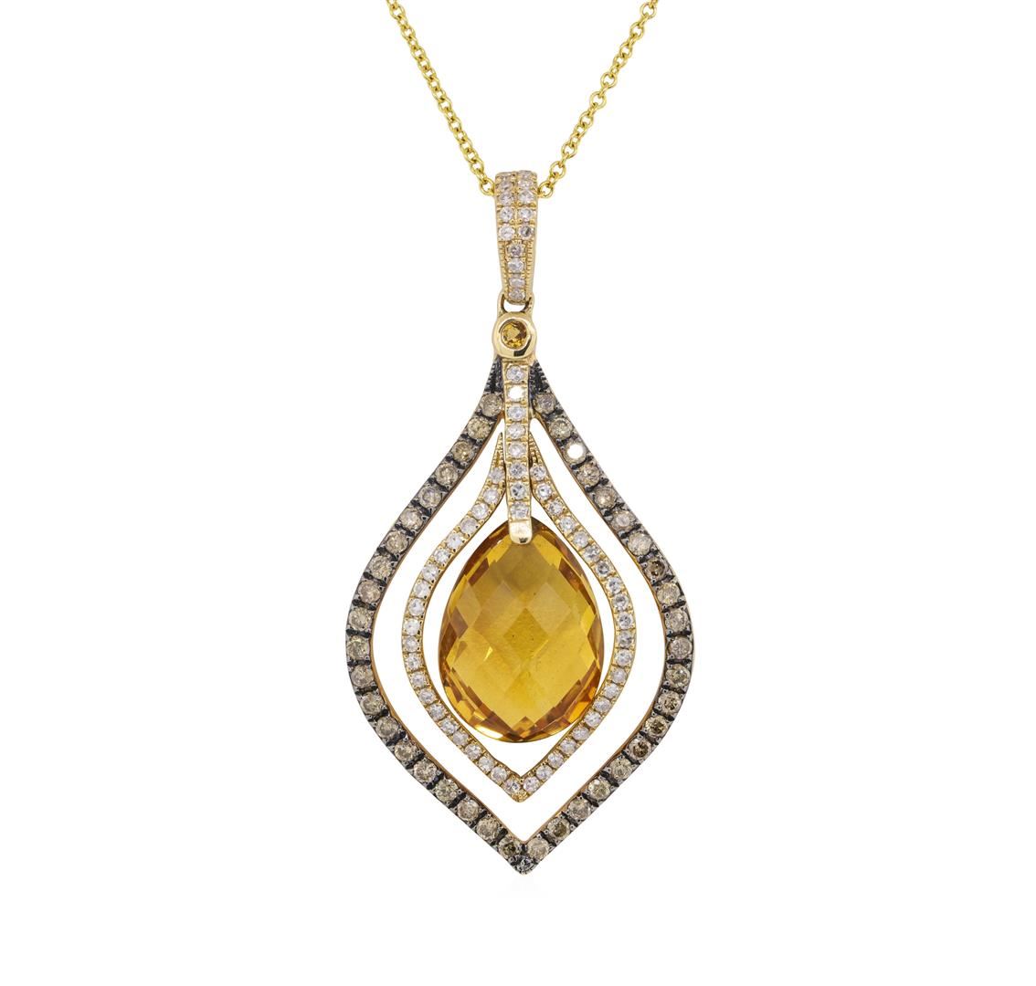 One electronically tested 14KT yellow gold lady's combination cast & assembled fashion pendant & chain 18.0' long, 1 mm oval cable link with a spring ring clasp with a dangle halo with a bright polish finish. Trademark is Effy. Identified with markings of '14K'. Condition is new, good workmanship. Containing: One claw set briolette modified mixed cut natural citrine quartz, measuring 14.00 x 10.20 x 5.61mm, (depth est.) approximate weight of 4.50ct., clarity is eye clean, medium, brownish, orangy yellow color, (GIA oY 5/3), cut is very good. Colored gemstones are presumed to have been subjected to commonly used enhancement processes. Graded in the setting. Sixty-Four prong set single cut diamonds, measuring 1.20 - 1.10 x 0.71mm (depth est.) approximate total weight of 64 Stones = 0.36ct. Graded in the setting. Color G - H Clarity SI-2 to I-1 Cut Good Thirty-Eight prong set round brilliant cut diamonds, measuring 1.60 - 1.50 x 0.93mm (depth est.) approximate total weight of 38 Stones = 0.50ct. Colored gemstones are presumed to have been subjected to commonly used enhancement processes. Graded in the setting. Color Fancy Dark Brownish Yellowish Clarity SI-2 to I-1 Cut Good. Total Weight of Colored Stones 4.50ct.. Total Weight of Diamonds 0.86ct.. Total Weight of Pendant & Chain 5.60gm GAS Appraised at $2885.00. GAS Appraised at $2,885.00.