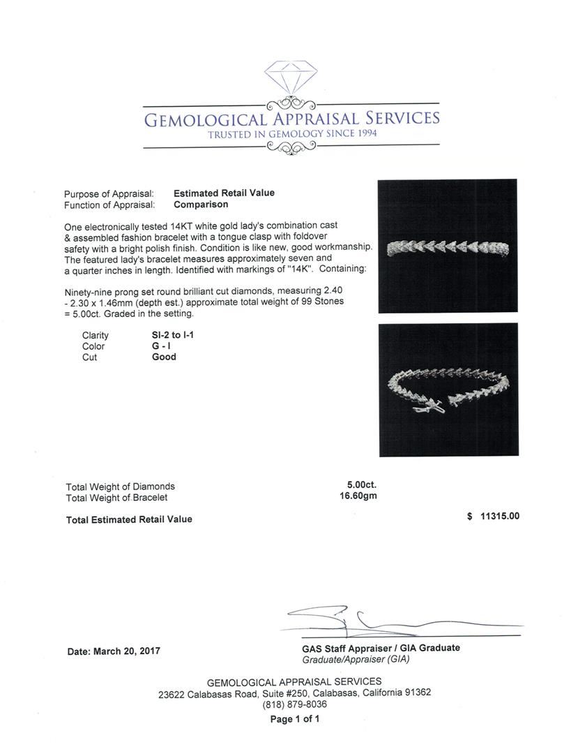 One electronically tested 14KT white gold lady's combination cast & assembled fashion bracelet with a tongue clasp with foldover safety with a bright polish finish. The featured lady's bracelet measures approximately seven and a quarter inches in length. GAS Appraised at $11,315.00.