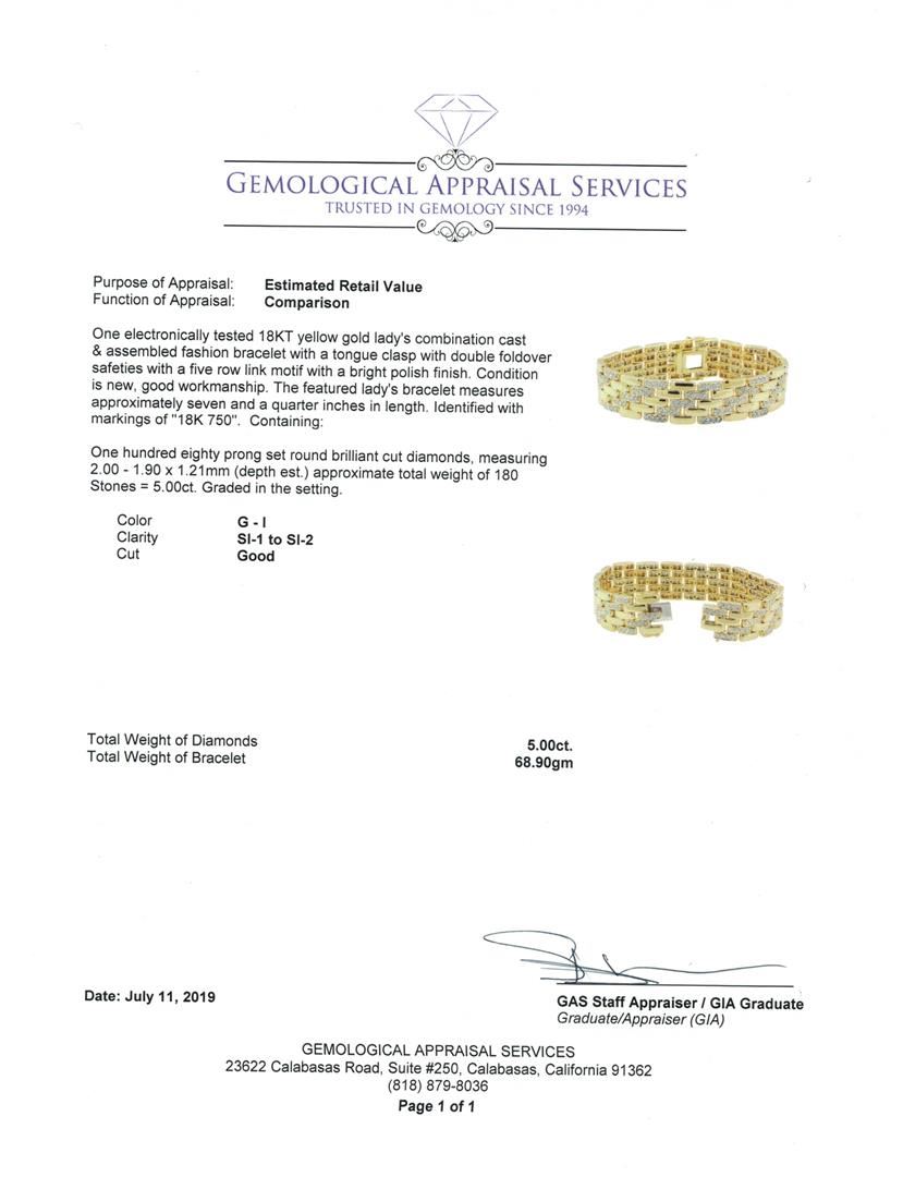 One electronically tested 18KT yellow gold lady's combination cast & assembled fashion bracelet with a tongue clasp with double foldover safeties with a five row link motif with a bright polish finish. The featured lady's bracelet measures approximately seven and a quarter inches in length. Identified with markings of '18K 750'. Condition is new, good workmanship. Containing: One Hundred Eighty prong set round brilliant cut diamonds, measuring 2.00 - 1.90 x 1.21mm (depth est.) approximate total weight of 180 Stones = 5.00ct. Graded in the setting. Color G - I Clarity SI-1 to SI-2 Cut Good. Total Weight of Diamonds 5.00ct.. Total Weight of Bracelet 68.90gm GAS Appraised at $21065.00. GAS Appraised at $21,065.00.