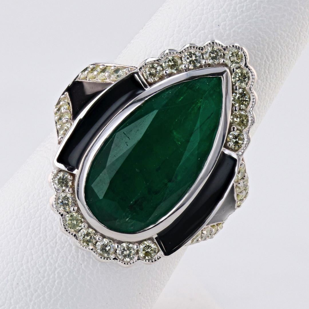 Eighteen karat (18K) white gold natural emerald beryl and diamond ring. A pear brilliant cut natural emerald beryl gemstone is mounted in the center of the ring. Round brilliant cut diamonds accent the ring around and on both sides of the center gemstone. The ring has a gross weight of 11.3 Grams. (Black Enamel Set in the Center of the Ring) Reference: GIA Emerald Report #6223229392 #NATURAL GEMSTONE# GEMSTONE: Emerald Beryl; NATURE: Natural; SHAPE: Pear Brilliant, Faceted Cut; WEIGHT: 5.00 carat total; DIMENSIONS: 19.09 x 9.44 x 3.94mm; CLARITY: Type 3; COLOR: Green (5/5); SYMMETRY: Excellent; COLOR INTENSITY: Intense; TRANSPARENCY: Transparent-Semi-Transparent; TONE: Dark #NATURAL DIAMOND# SHAPE: Round Brilliant Cut; WEIGHT: 0.99 carat total (32pcs.); DIMENSIONS: 3.0 x 2.6mm; AVERAGE CLARITY: SI1-SI2; AVERAGE COLOR: H-I; SYMMETRY: Excellent; POLISH: Excellent #METAL# METAL: Gold; PURITY: 18K (750); COLOR: White; CONDITION: Excellent; FINISH: High Polish #Size: 7 1/4